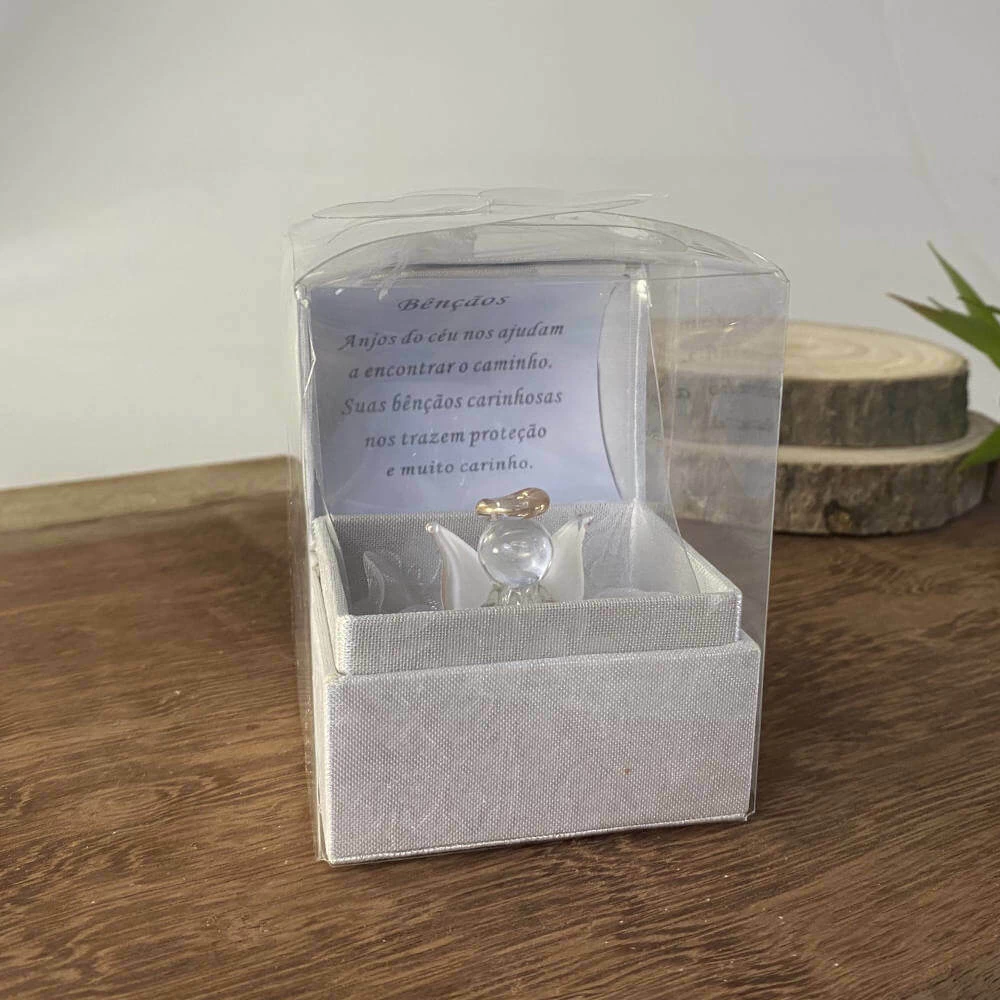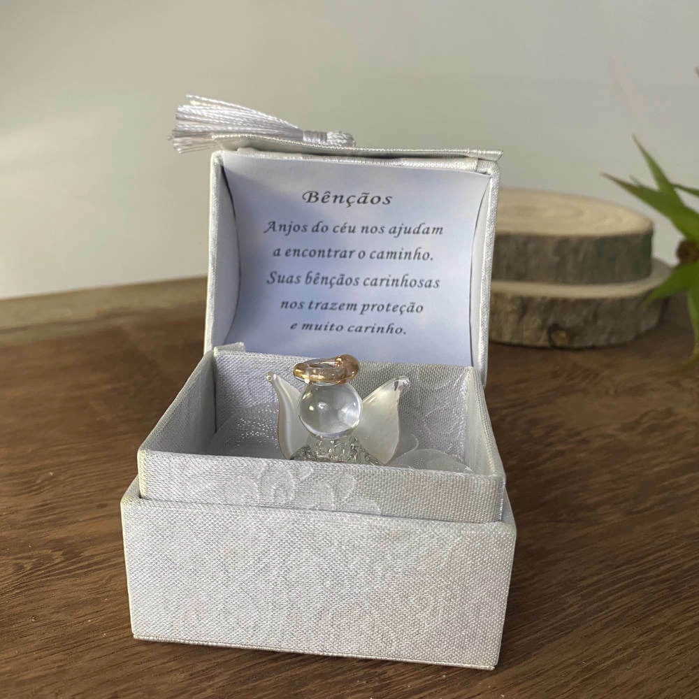 Um delicado anjo de cristal dentro de um baú com a mensagem:
