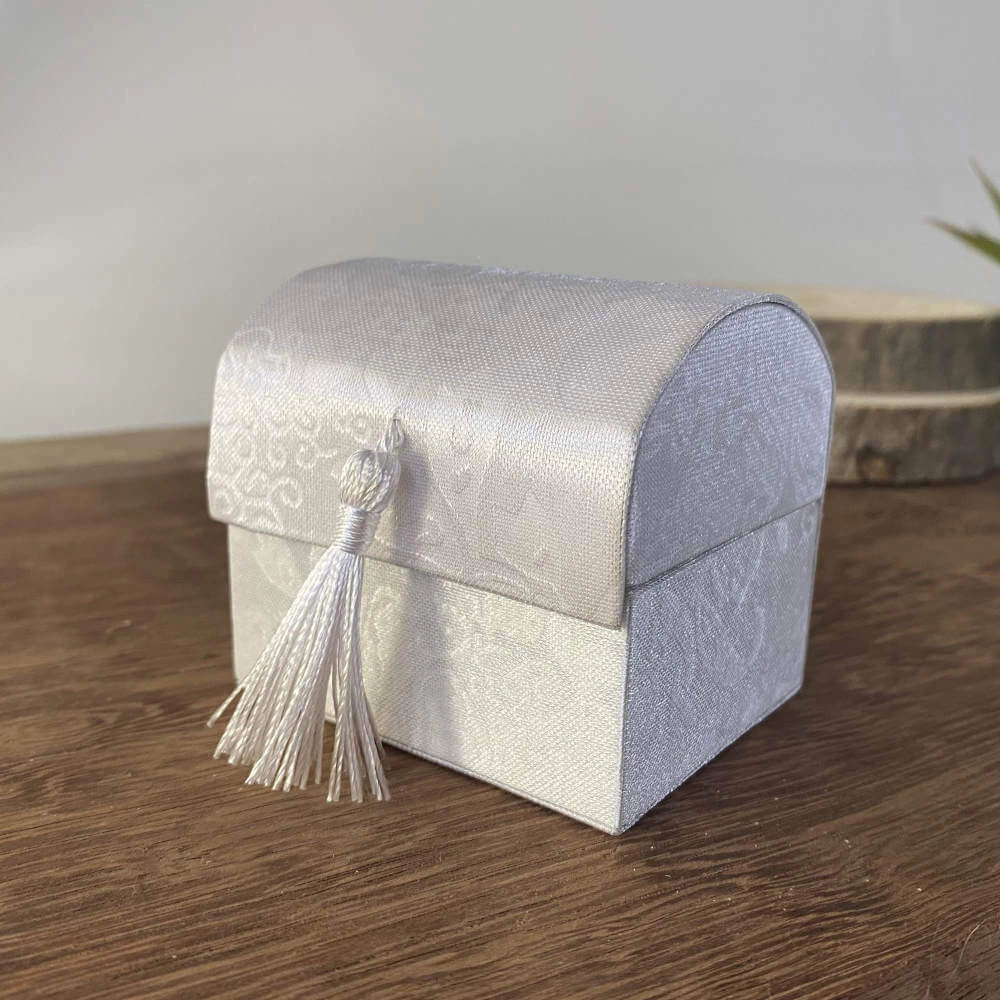 Material: caixa de papel encapado com tecido branco estilo adamascado. Anjo de cristal pintado com folha de ouro.