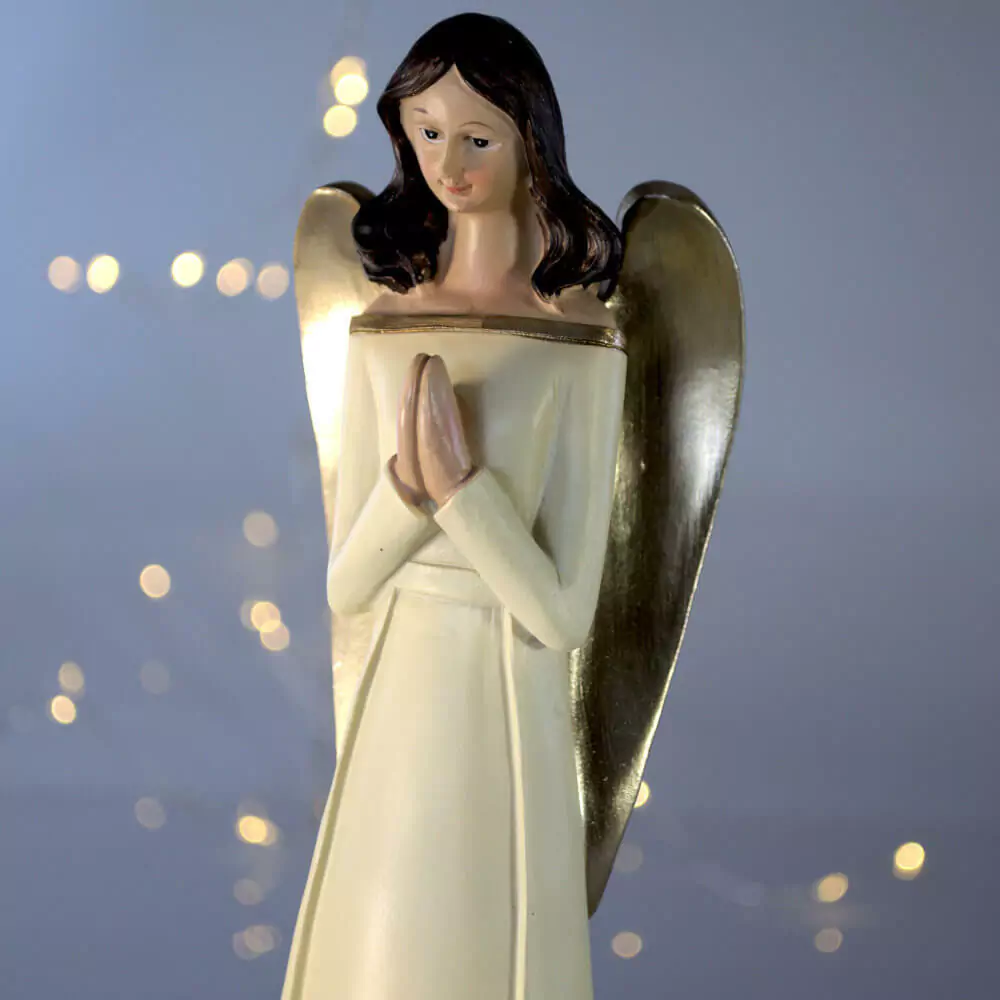 Anjo decorativo feito em resina com as asas douradas para decorar e abençoar sua casa.