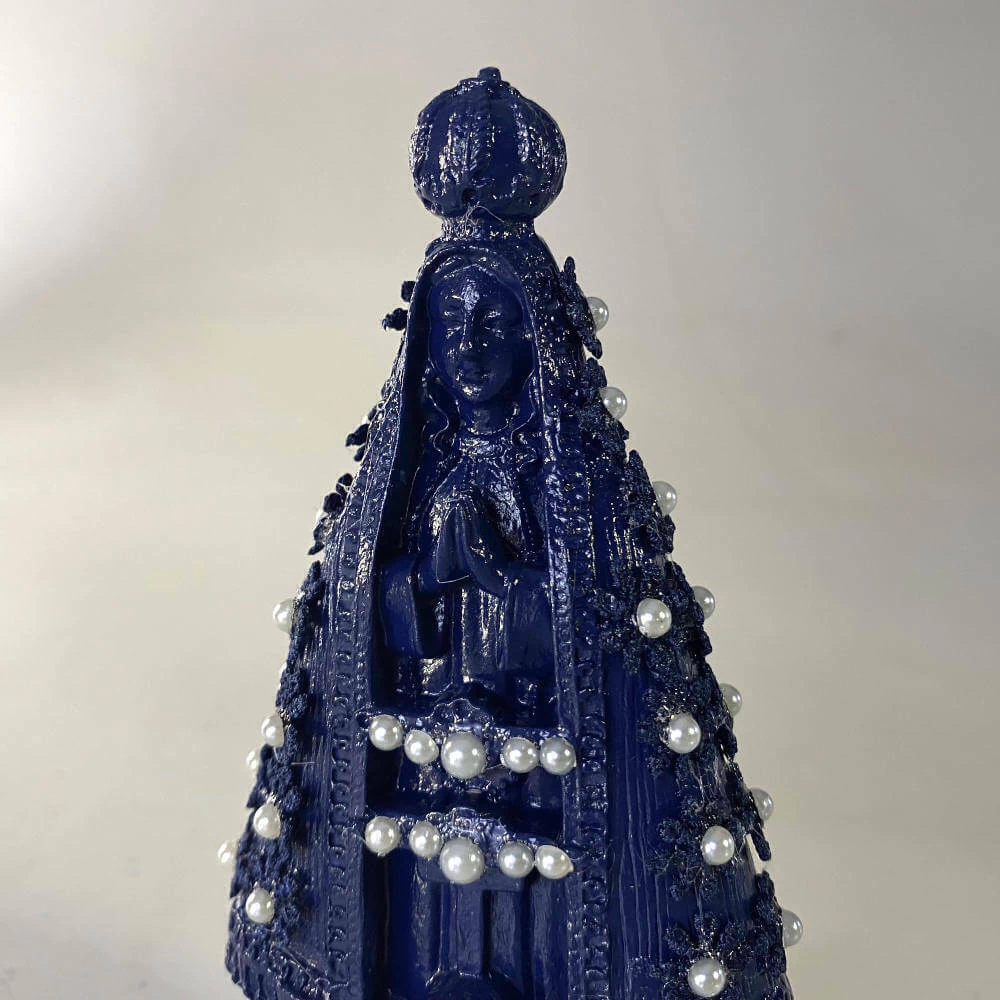 Esta imagem de Nossa Senhora Aparecida é uma representação delicada e elegante da padroeira do Brasil. Pintada em azul marinho com acabamento em alto brilho, traz apliques de renda na mesma tonalidade e pequenos pontos de pérolas no centro das flores, que acrescentam charme e refinamento à peça.