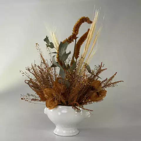 Material: vaso de cerâmica, flores secas e desidratadas variadas.