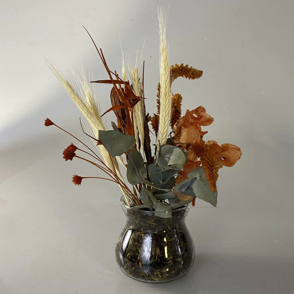 Arranjo artesanal com flores secas naturais desidratadas na cor terracota.