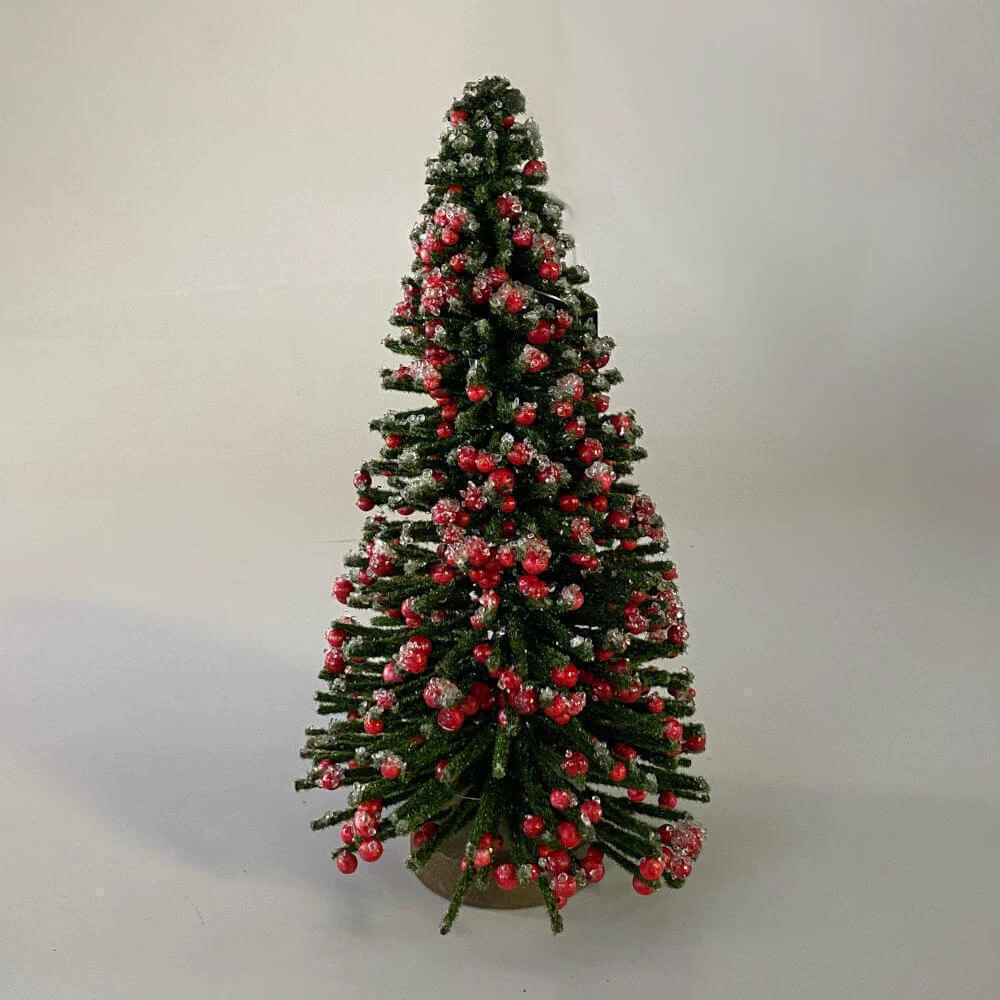 Esta árvore de mesa é uma versão menor, mas igualmente encantadora e sofisticada. Com estrutura aramada revestida por fios rústicos em tom verde, ela apresenta textura e naturalidade que remetem ao estilo artesanal. Suas pequenas bolinhas vermelhas imitam frutinhas berry cobertas por floquinhos de gelo, lembrando as tradicionais bolinhas de Natal.