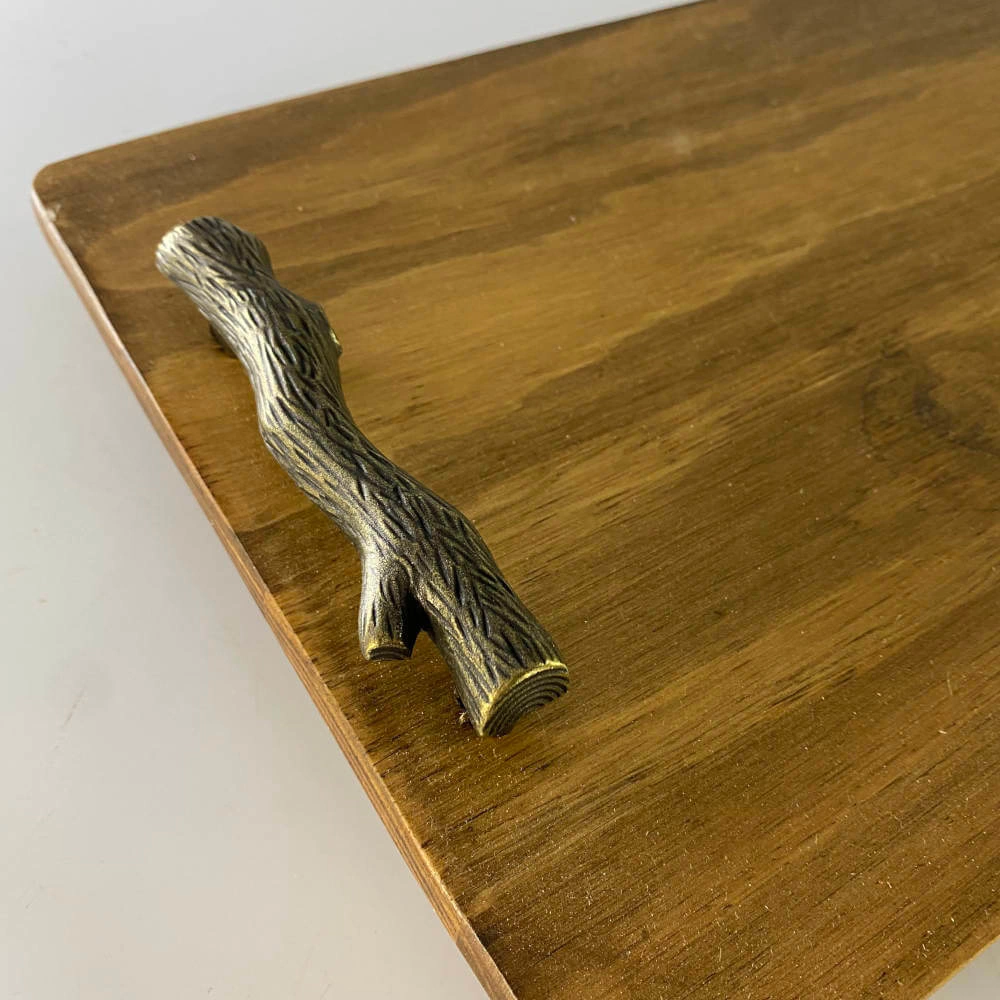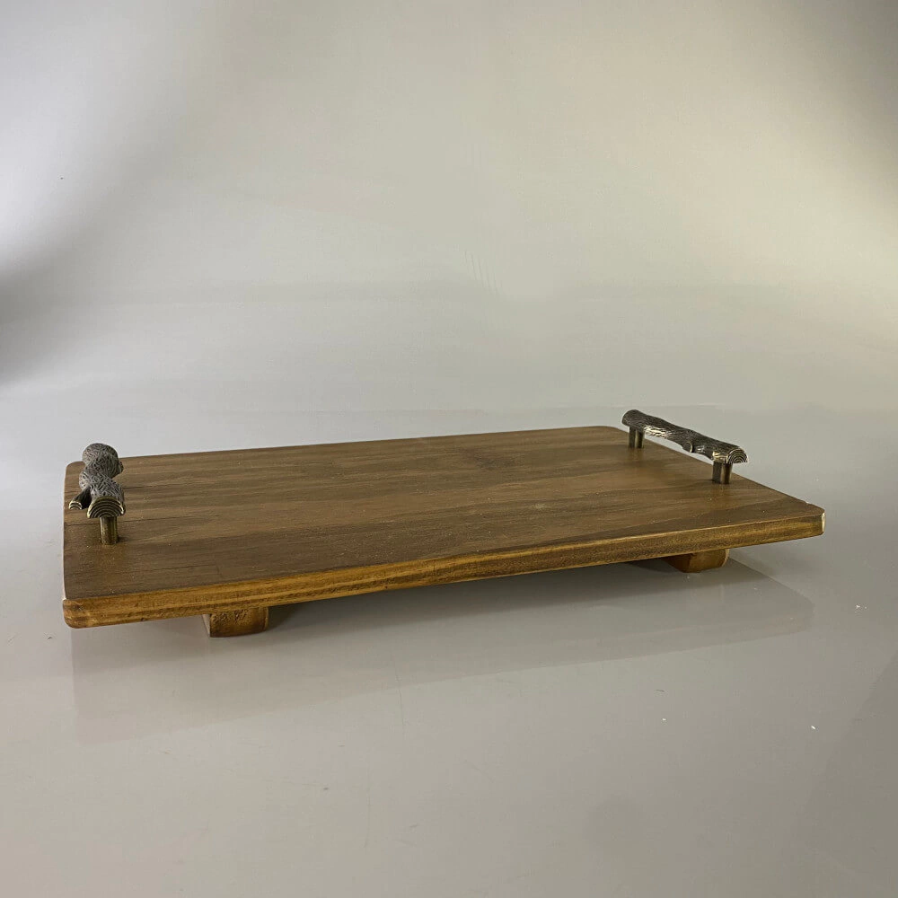 Bandeja decorativa de madeira com pegador em metal.