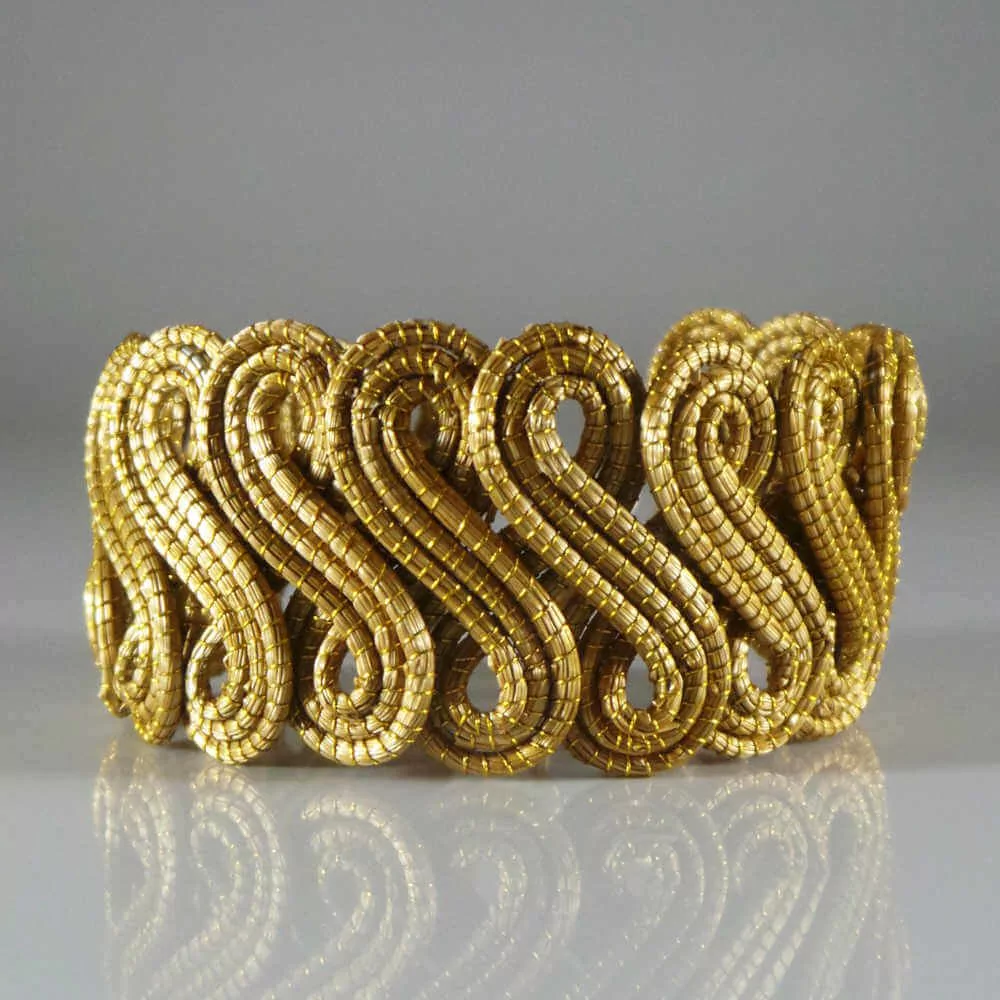 Material: Metal com banho dourado, fios de capim dourado e palha do buriti, trançados formando o desenho da pulseira.