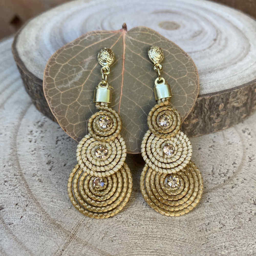 Delicado, esse brinco une três circulos, dois em capim dourado e um em palha do buriti.