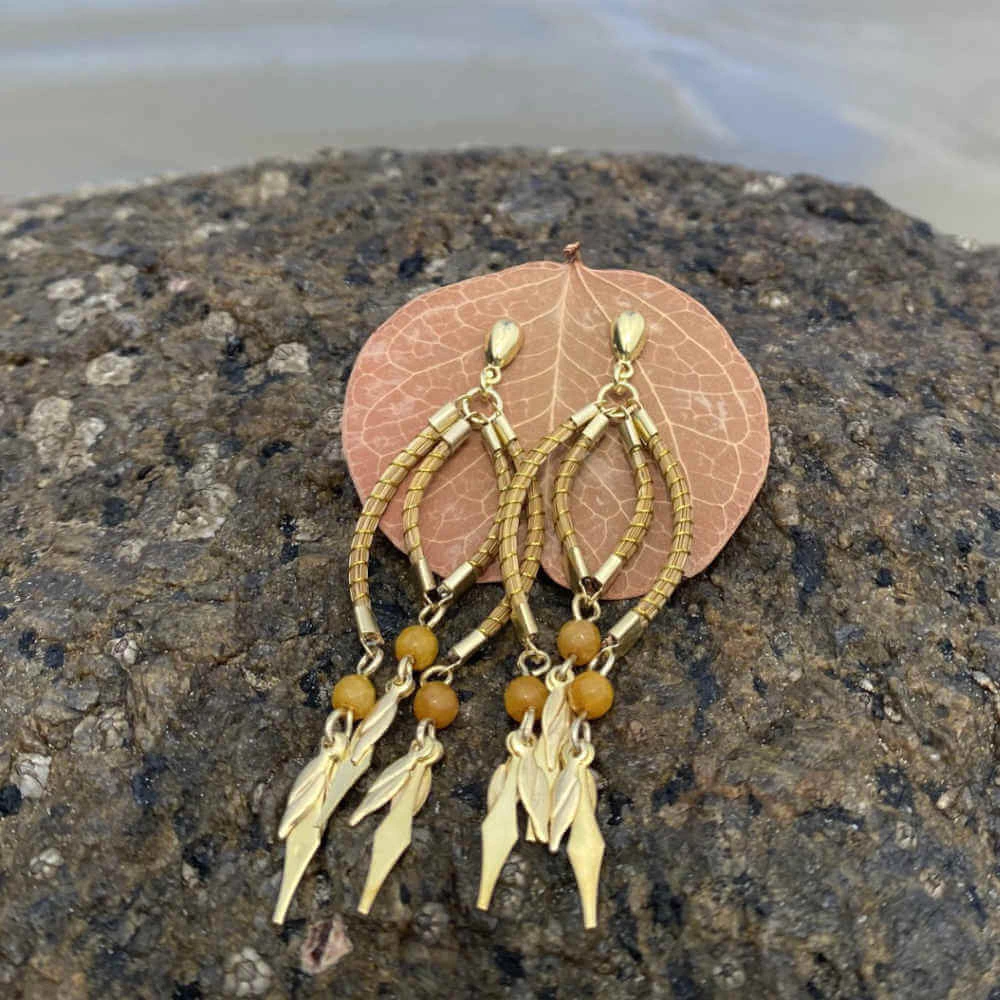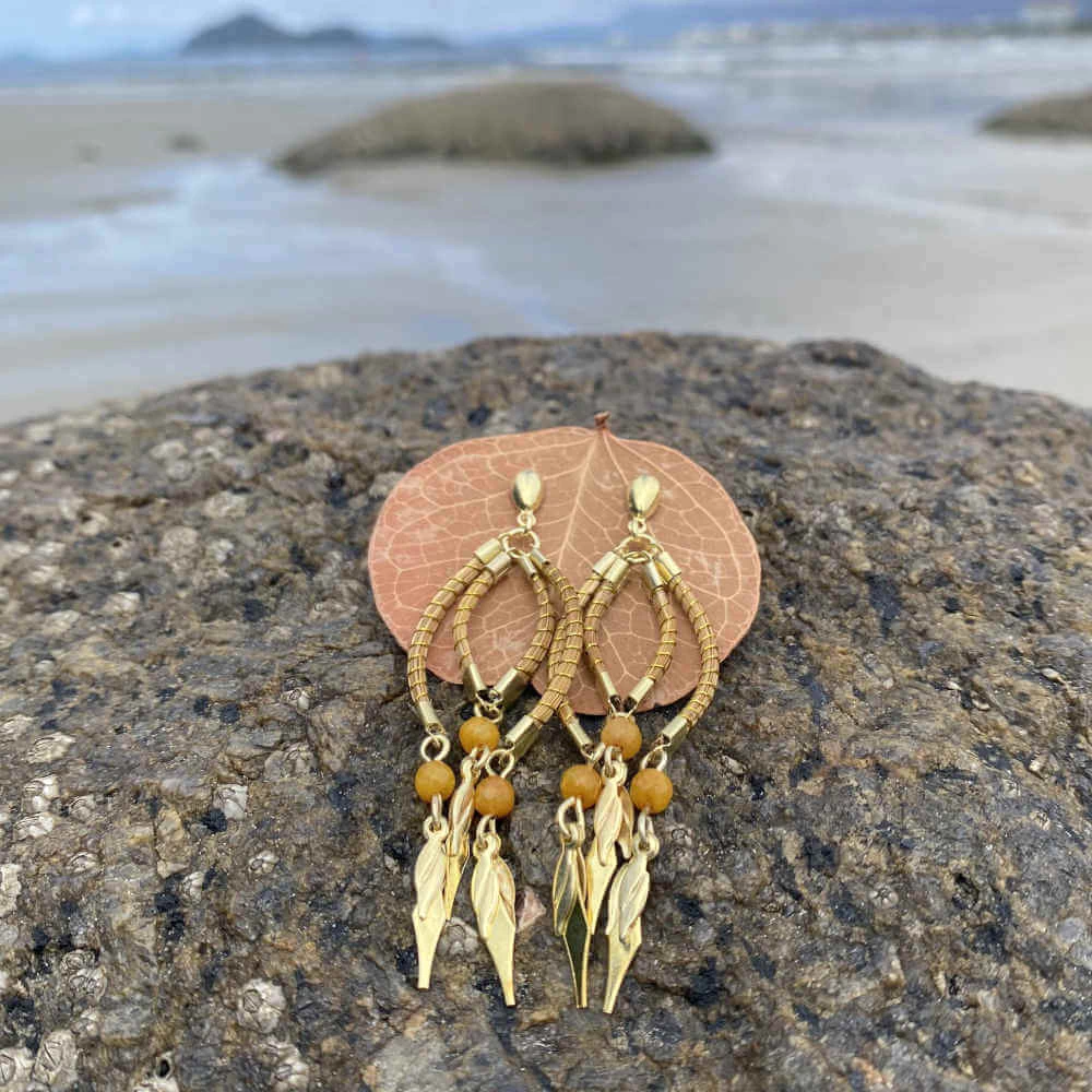 Brinco de capim dourado e pedra jade mostarda.