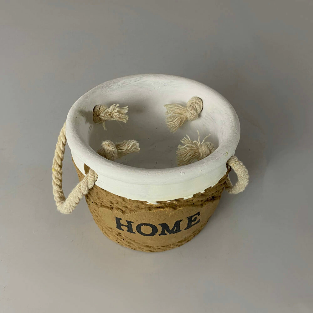 Charmoso, esse cachepot possui uma alça de corda e a palavra home escrita em um dos lados.