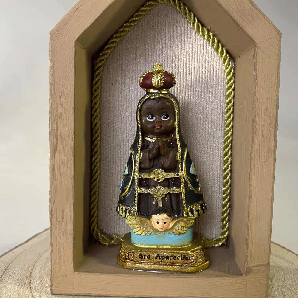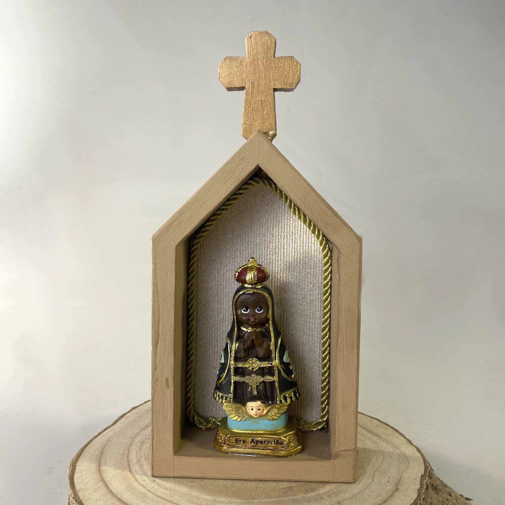 Esta capelinha artesanal transmite delicadeza e espiritualidade em cada detalhe. Produzida em madeira MDF pintada, ela traz no interior um fundo de tecido com acabamento em cordão dourado, que valoriza ainda mais a imagem de Nossa Senhora Aparecida Infantil. A escultura, fixada para maior segurança, convida à devoção e inspira a criação de um espaço especial de oração e proteção no lar.