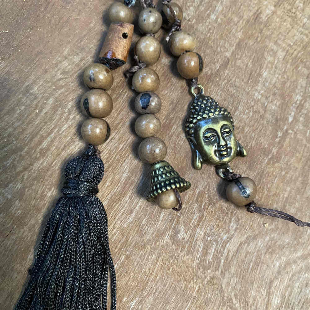 Material: fio encerado, metal com banho dourado envelhecido. Sementes de açaí e canela. Pingente de fio de seda.