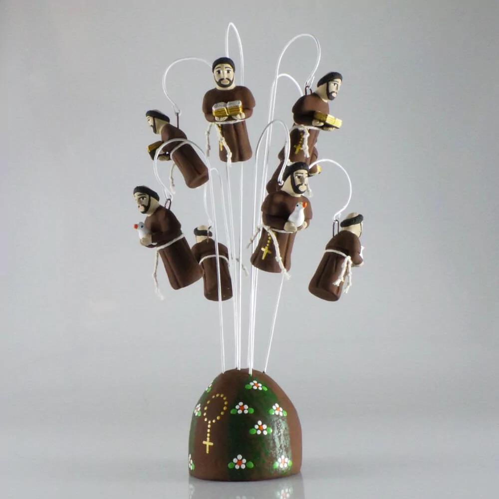 Dimensões: altura total da peça, 25 cm. Cada São Francisco mede 6 cm.