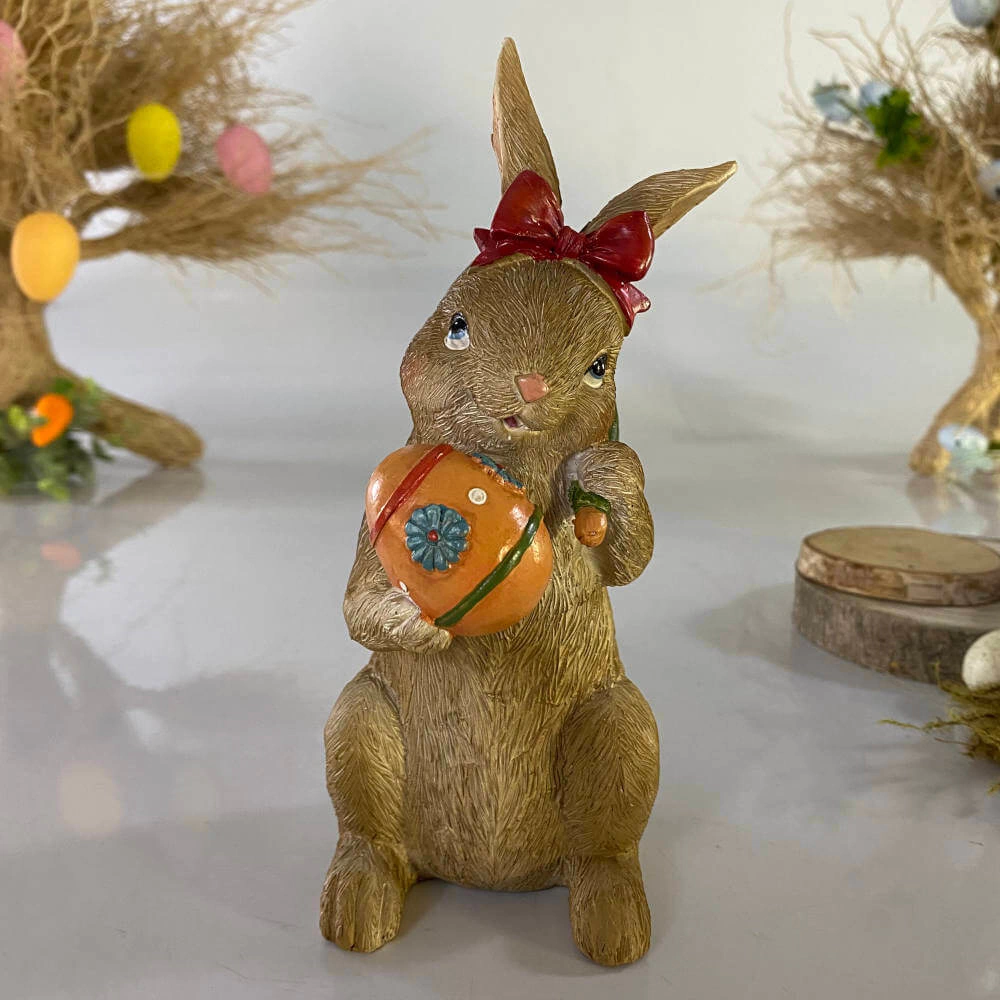 Coelhinha pintando seu ovo de páscoa, ela segura um ovo laranja e um pincel.