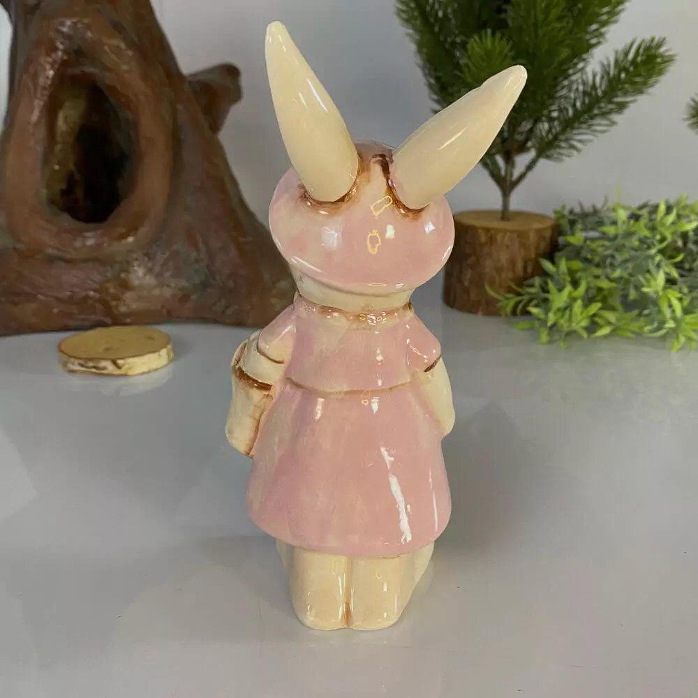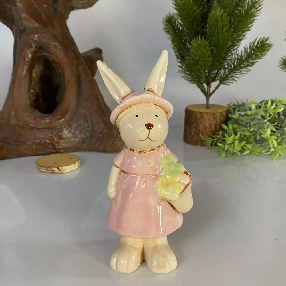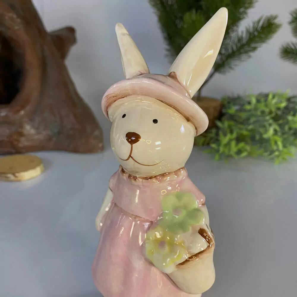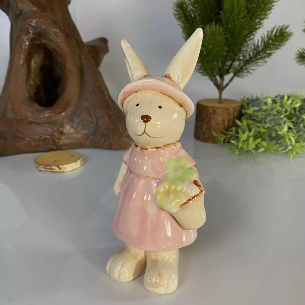 Com vestido cor-de-rosa e uma cesta de flores essa coelhinha é um encanto.