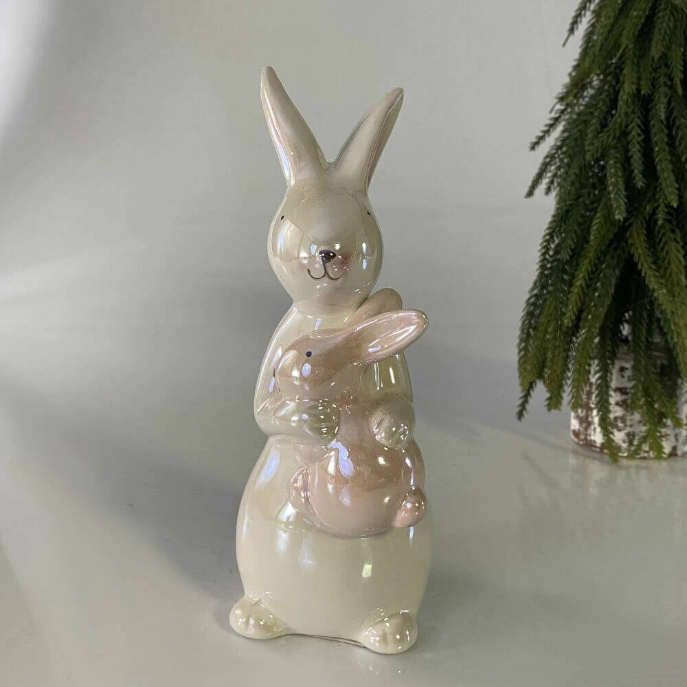 Coelinha em porcelana segurando sua coelhinha cor-de-rosa.