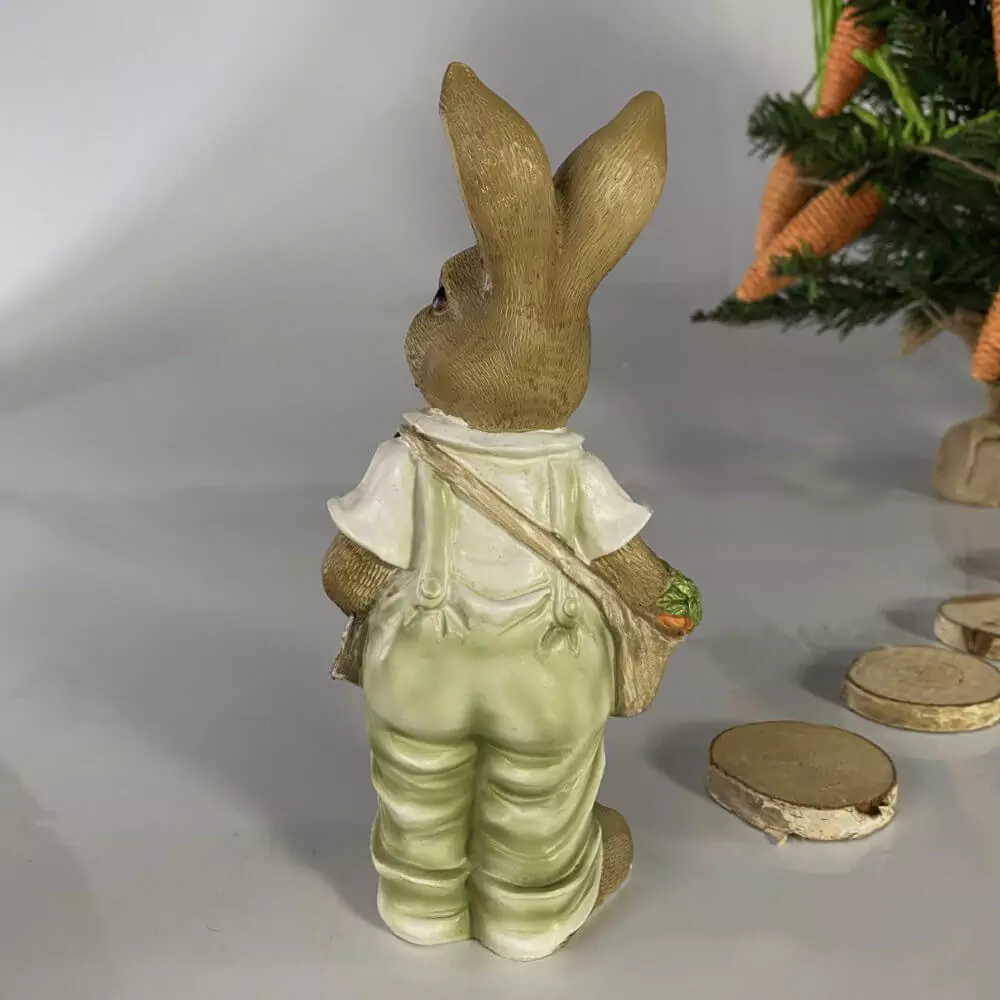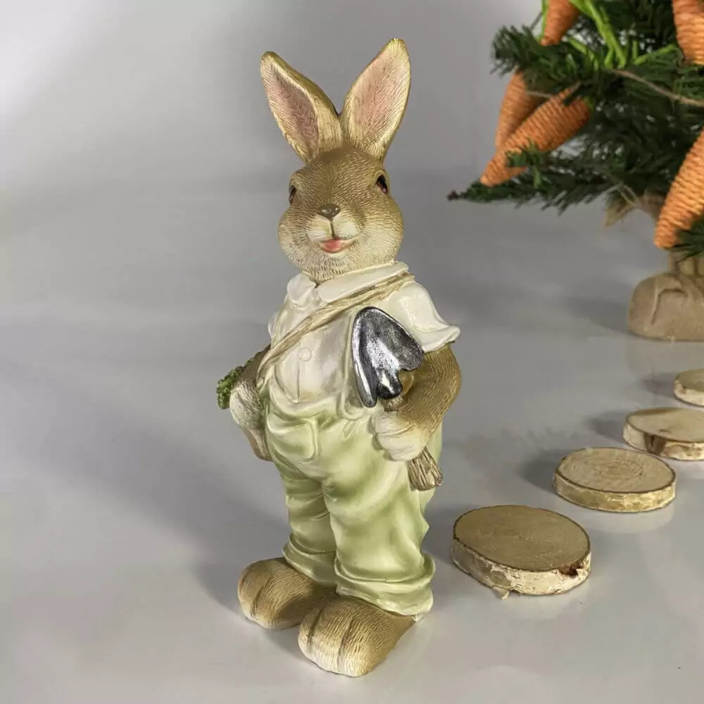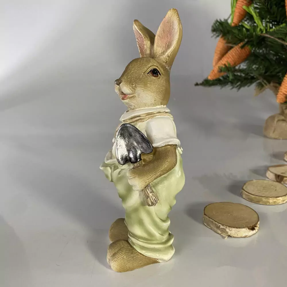 Coelhinho de páscoa jardineiro, segura sua pá e uma sacola de cenouras que acabou de colher.