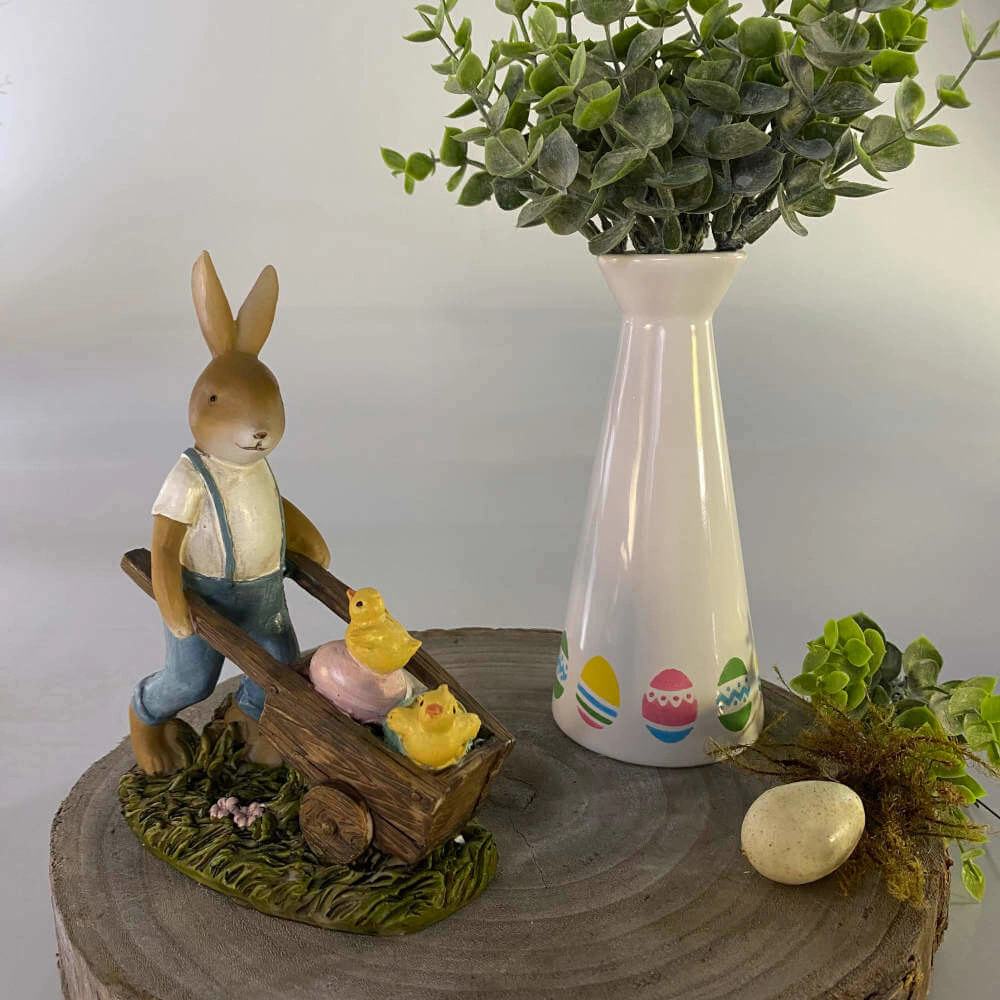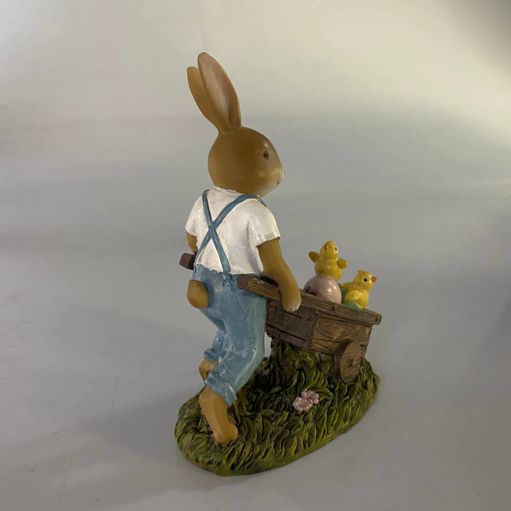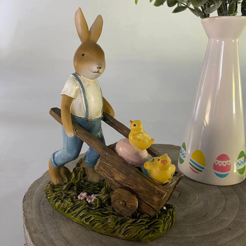 Coelho de resina com carriola e pintinhos.