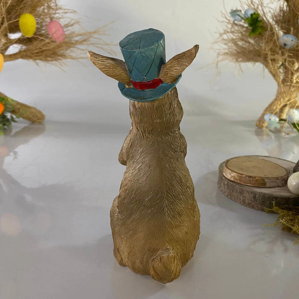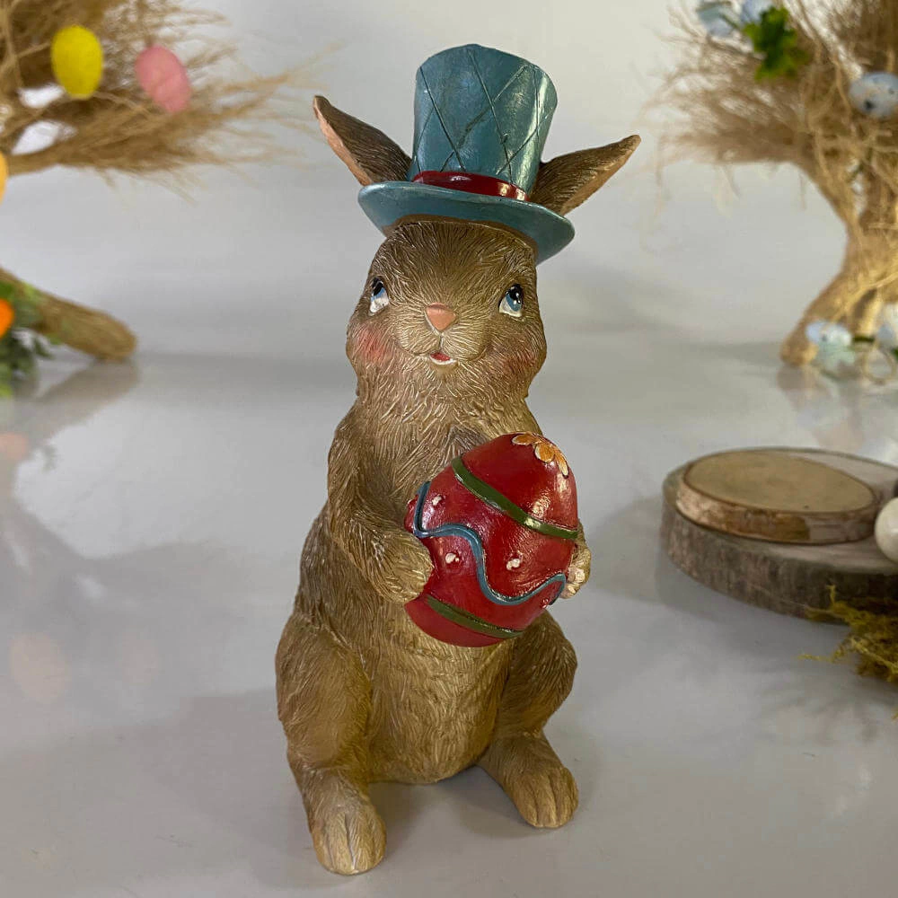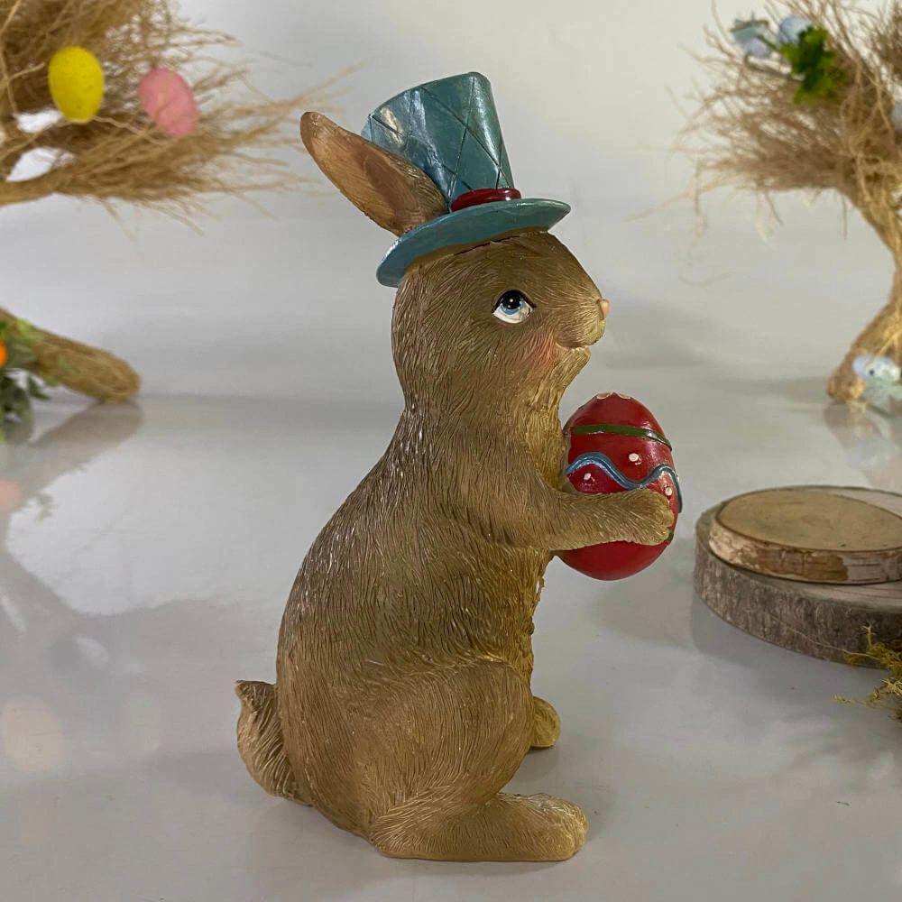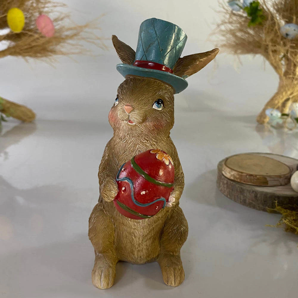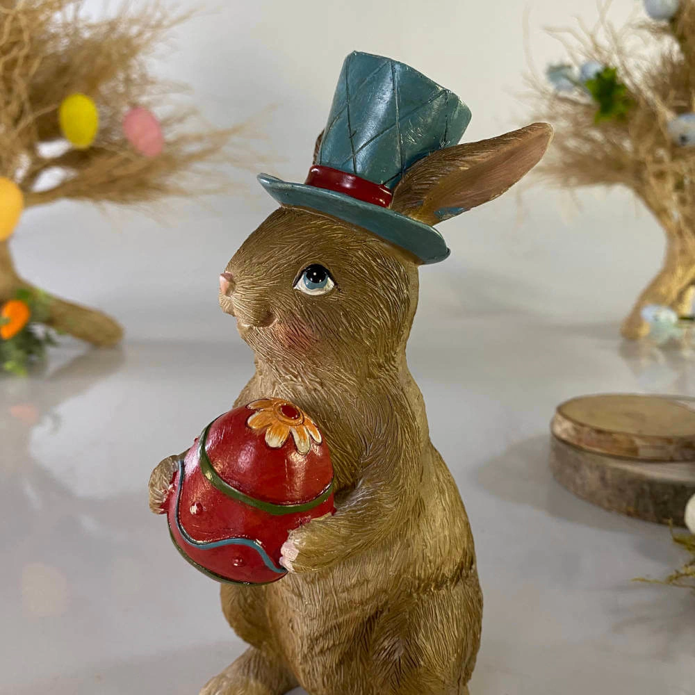 Coelho decorativo, ele segura um ovo vermelho e usa uma charmosa cartola azul.