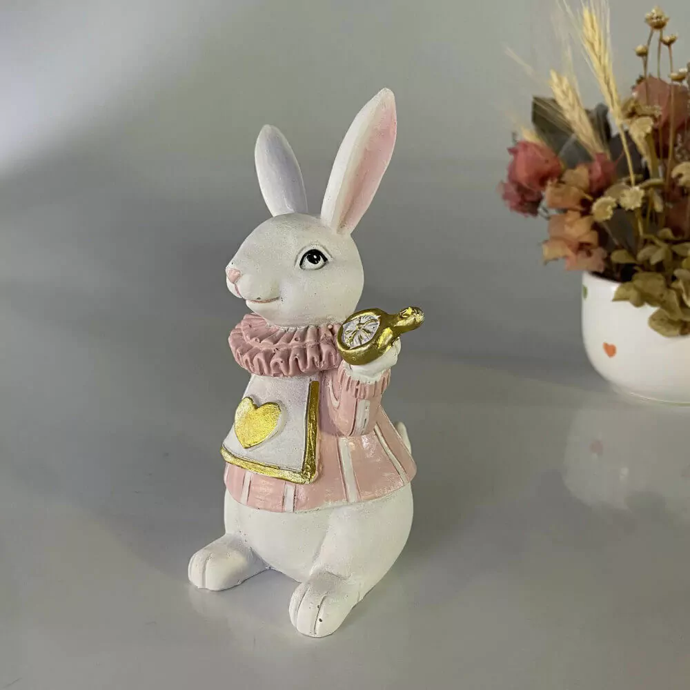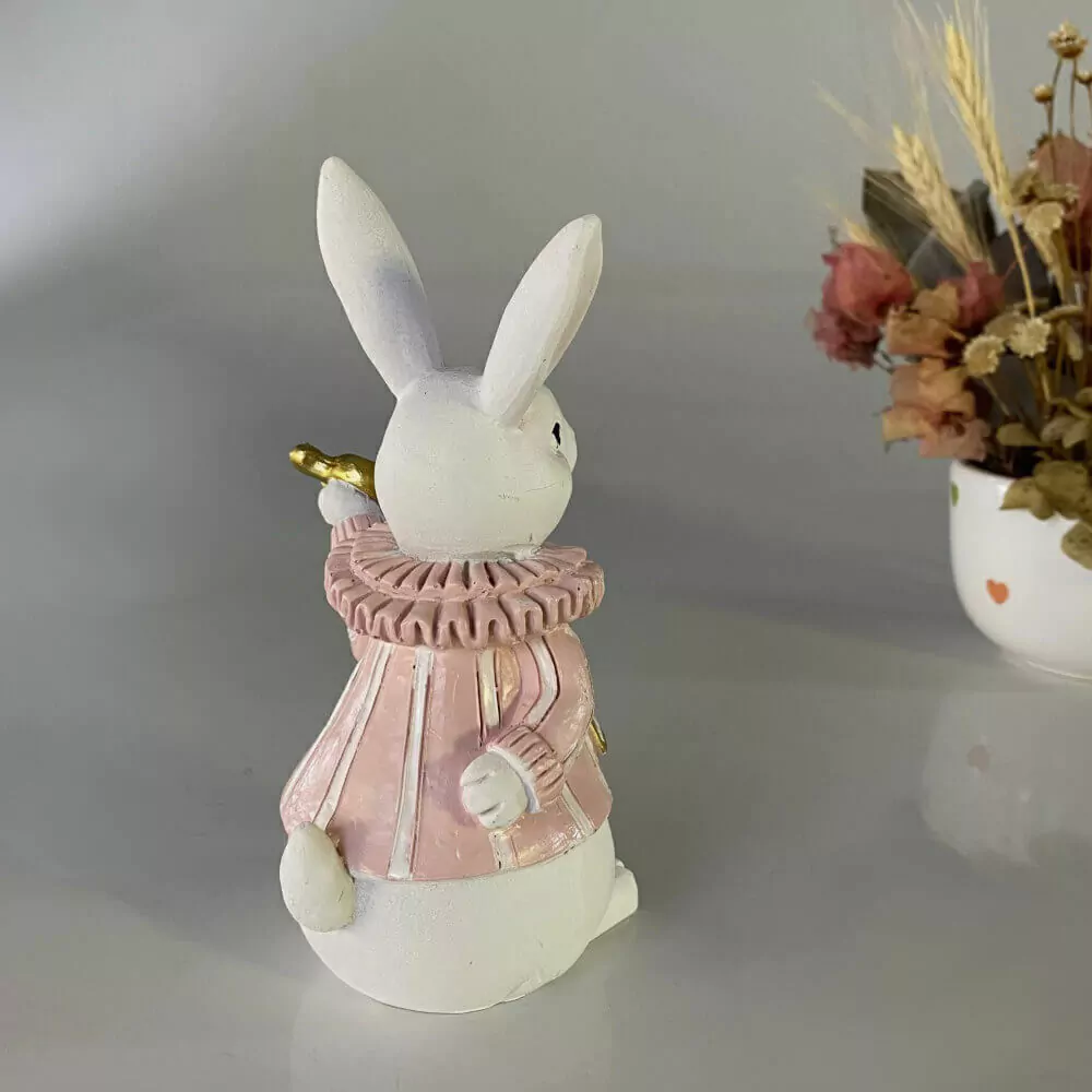 Coelho da páscoa branco com roupa rosa e gola rufo.