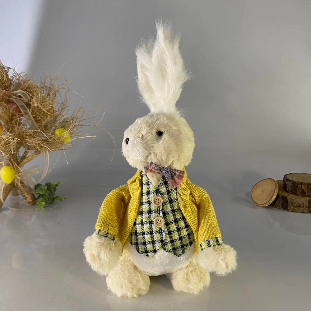 Com orelhas peludas e longas esse estiloso coelho veste seu casaco amarelo e gravata borboleta.