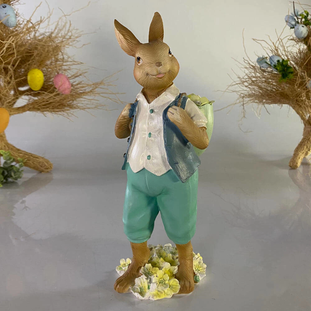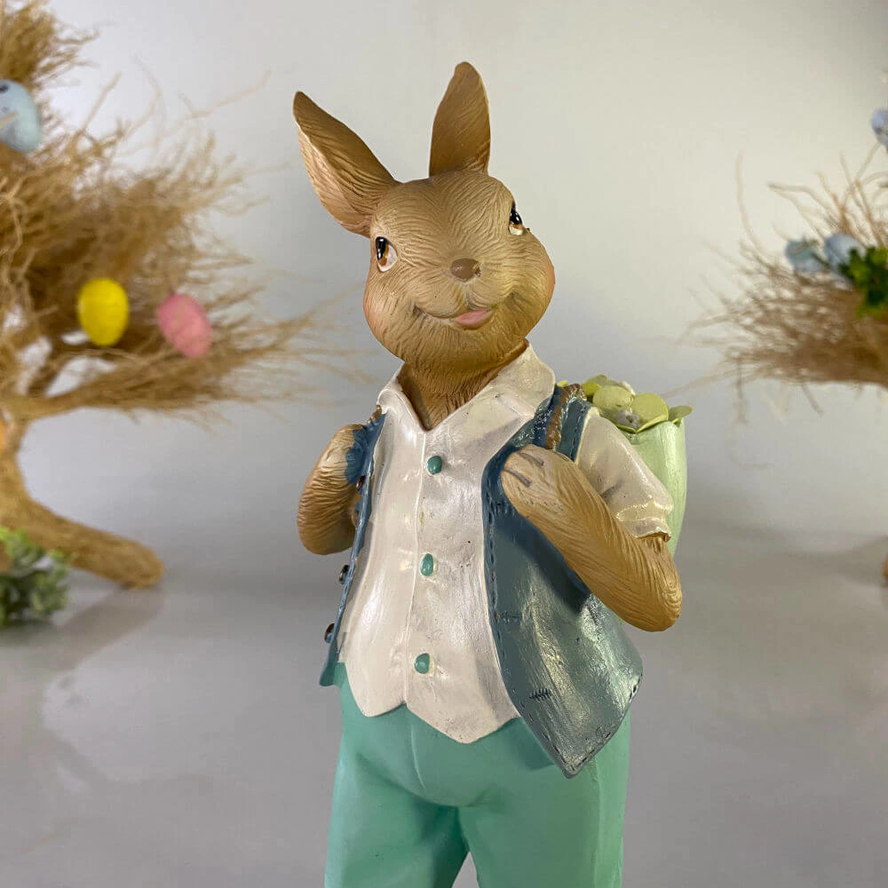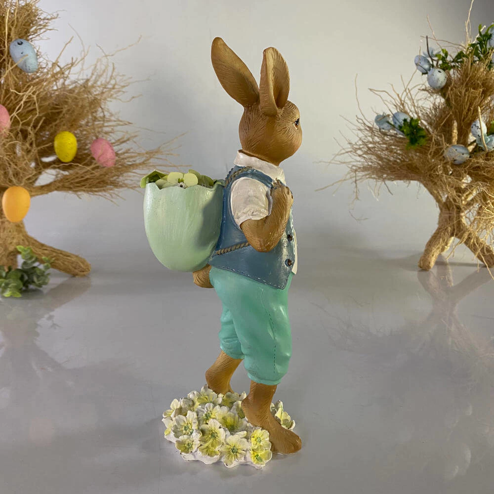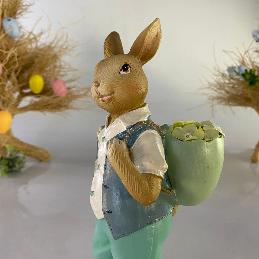 Coelho de páscoa com sua roupa azul. Ele leva uma cesta de flores nas costas.