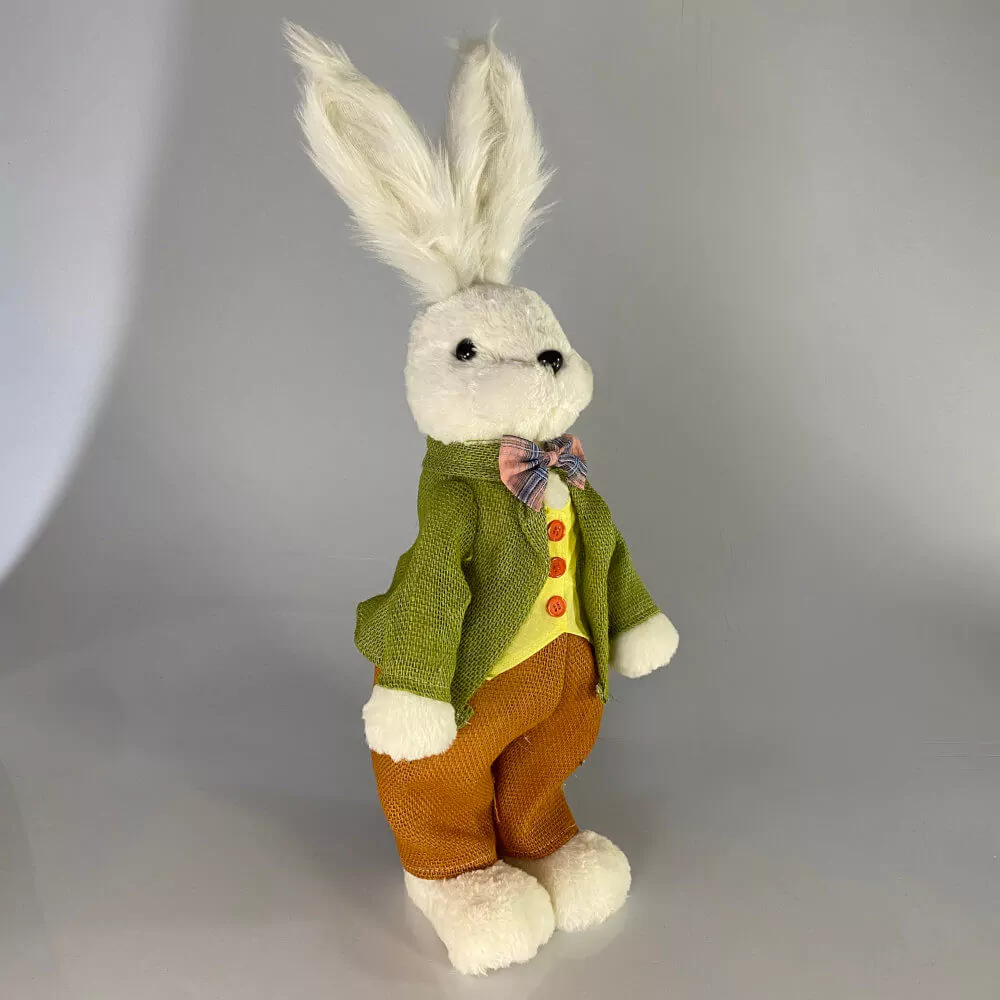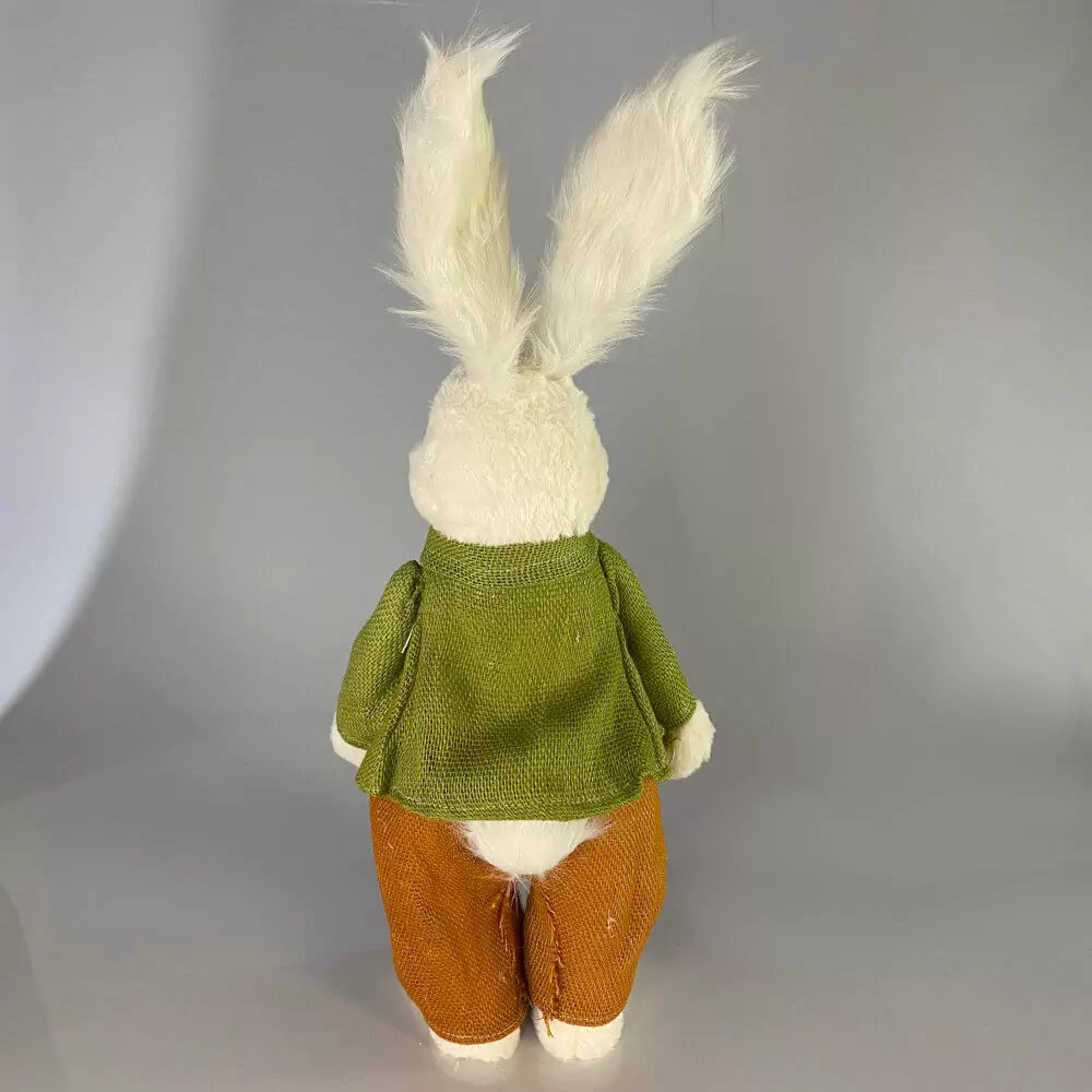 Coelho branco decorativo de pelúcia e roupa colorida de juta.