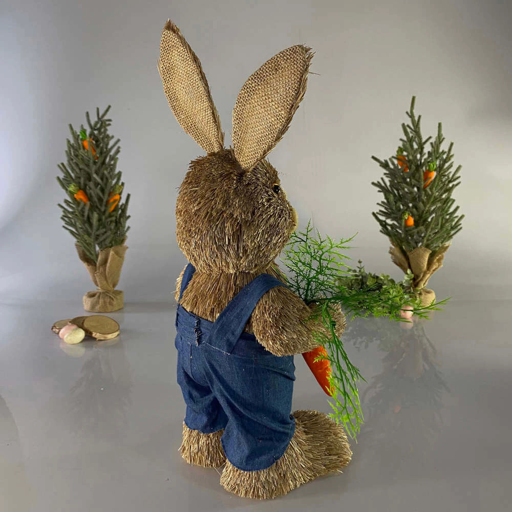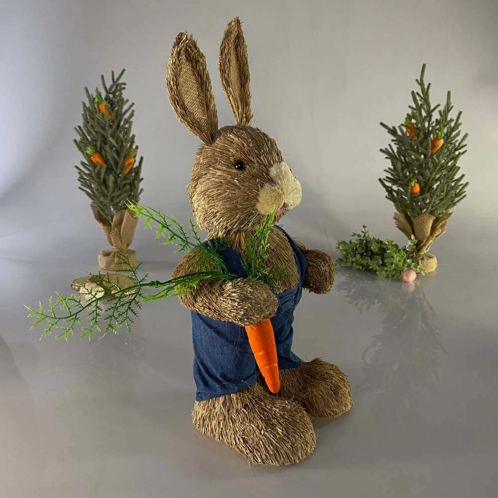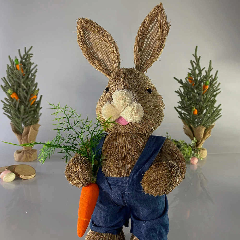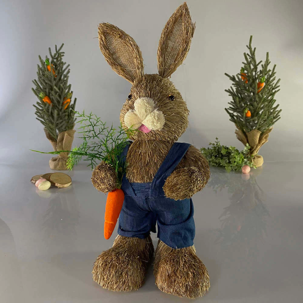 Ele veste uma jardineira jeans e segura uma cenoura.