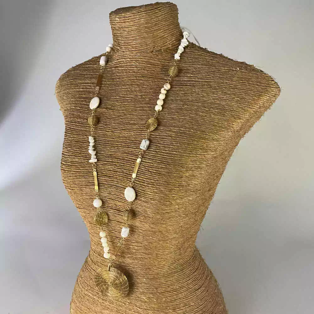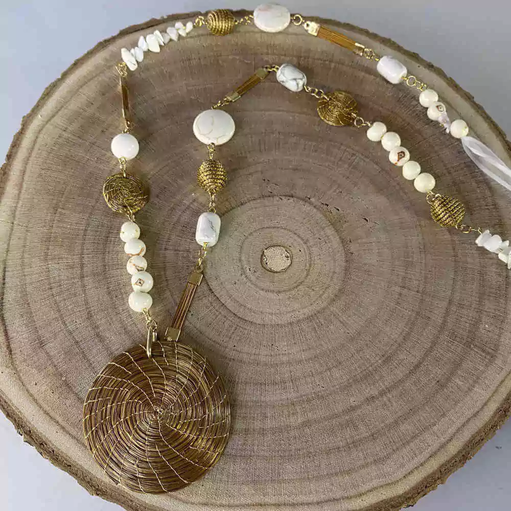 Material: fita branca, capim dourado, sementes de açaí, pedra howlita e cascalho de pedra.