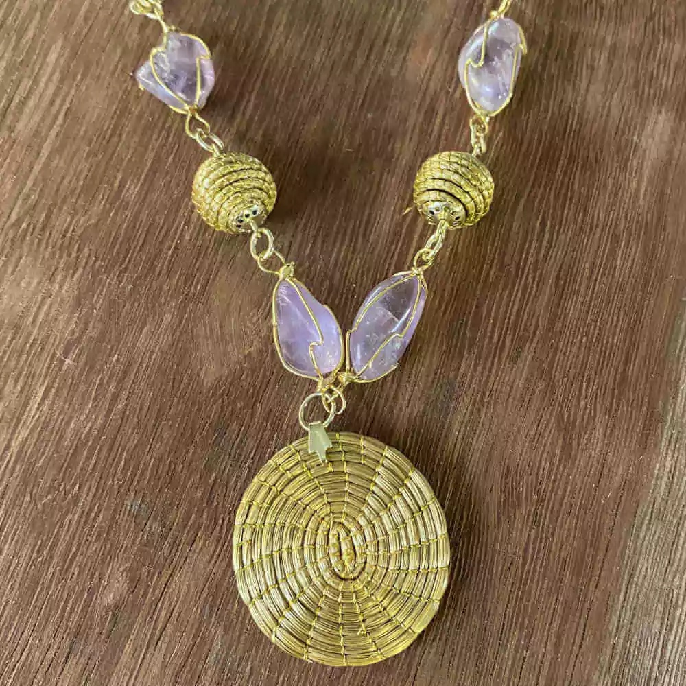 Colar artesanal confeccionado com capim dourado e ametistas polidas.