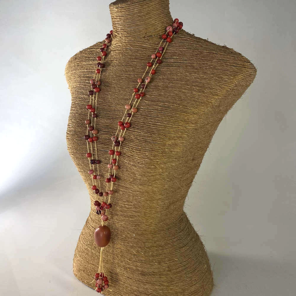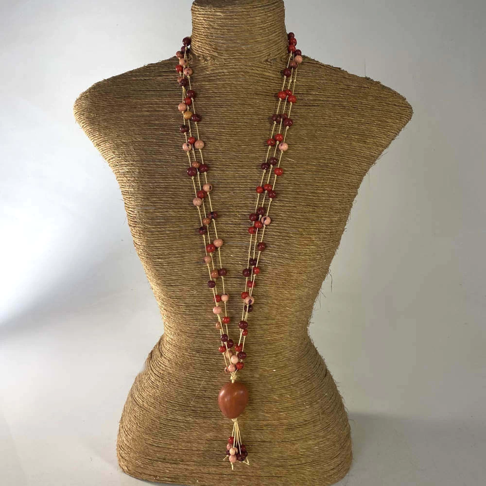 Este colar artesanal é confeccionado com sementes de açaí naturais em tons de rosa claro, vermelho vivo e marsala, resultando em uma peça alegre, cheia de energia e personalidade. Seu formato longo, com 55 cm de comprimento aproximado, é ideal para quem prefere colares mais compridos e confortáveis, perfeitos para complementar looks casuais ou mais sofisticados.