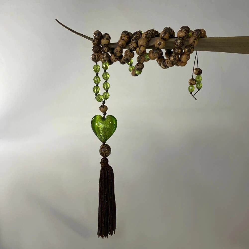Material: cristais facetados na cor verde, sementes de açaí. Coração de murano e pingente de fio de seda.