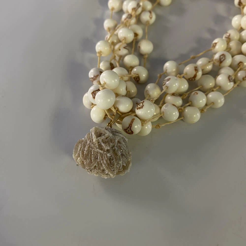 O destaque da peça é o pingente de Rosa do Deserto, uma pedra natural que carrega consigo significados como crescimento, equilíbrio emocional e resistência frente às adversidades.