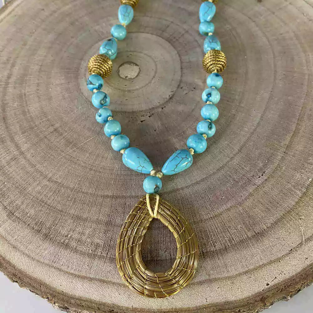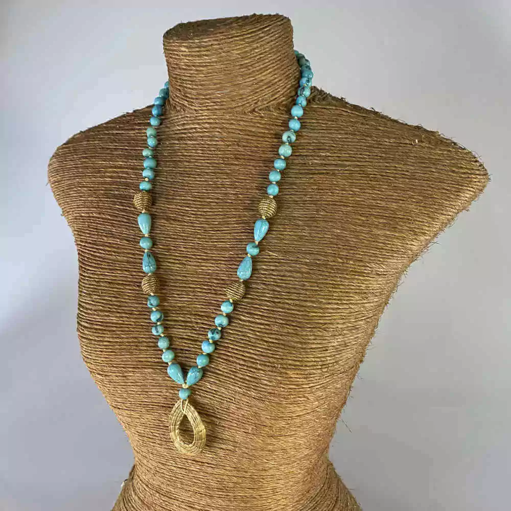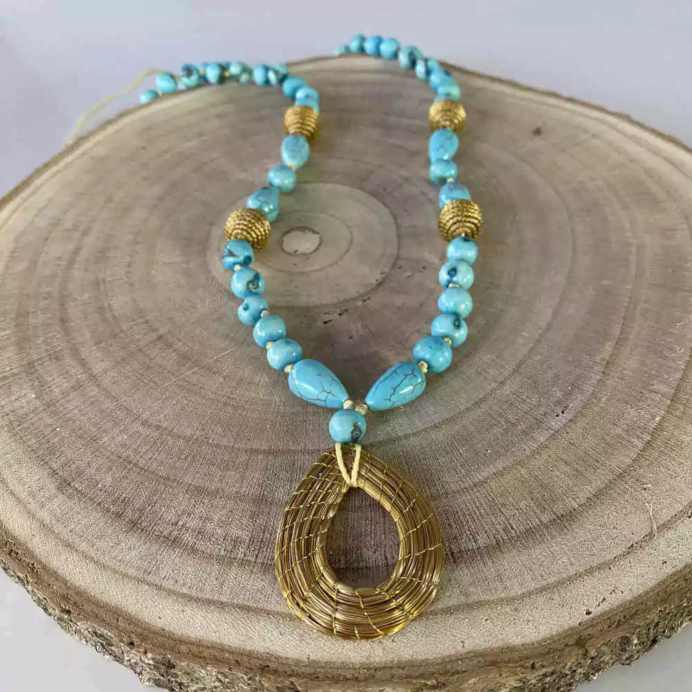 Biojoia, feita com produtos naturais, pedra howlita turquesa, sementes de açaí e capim dourado.