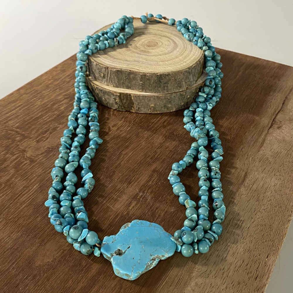 Além do cascalho de pedra turquesa, destaque para o medalhão de pedra. De forma orgânica, chama a atenção pela, cor e formato natural.