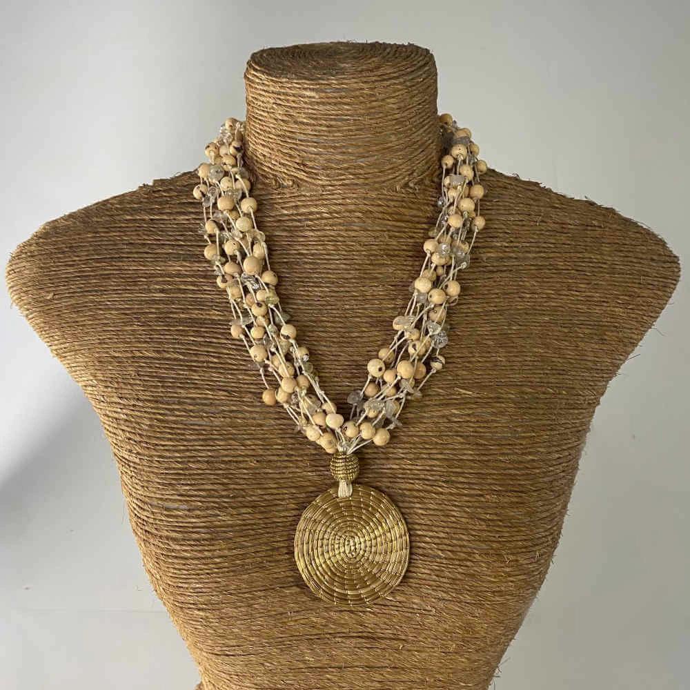 Biojoia brasileira com sementes, capim dourado e cascalho de quartzo.