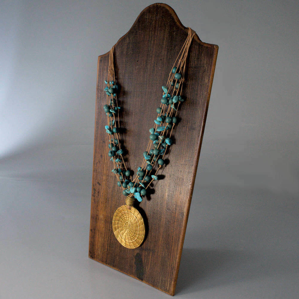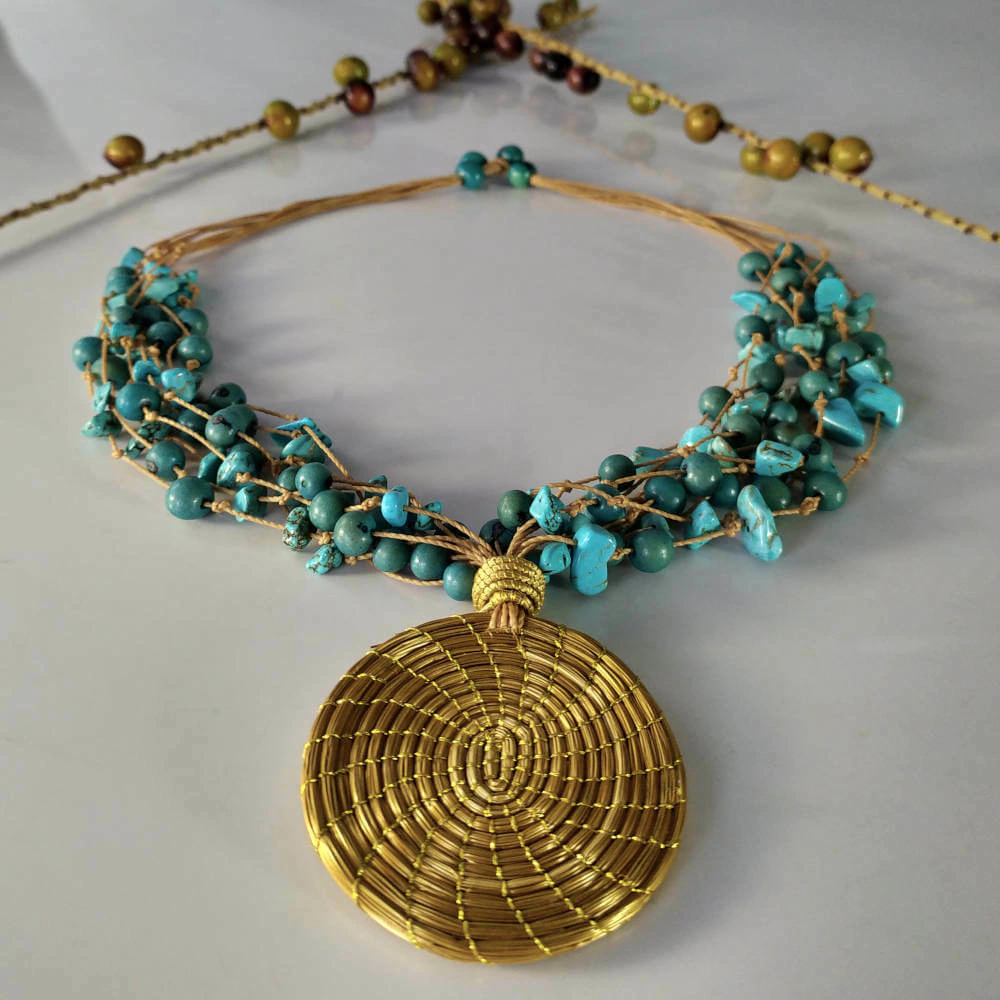 Colar feito em nosso atelier combinando a cor turquesa em suas sementes e pedras com o brilho natural do capim dourado.