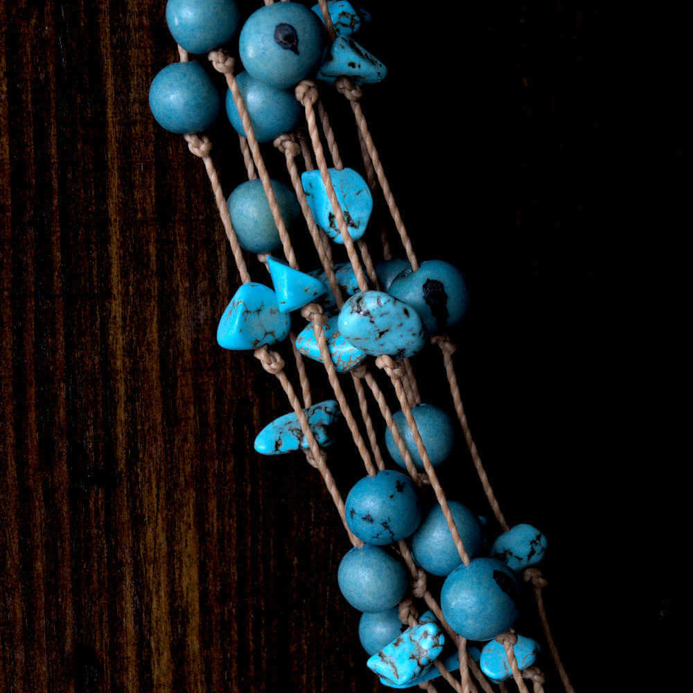 Material: sementes de açaí, pedras turquesa, fio encerado e capim dourado.