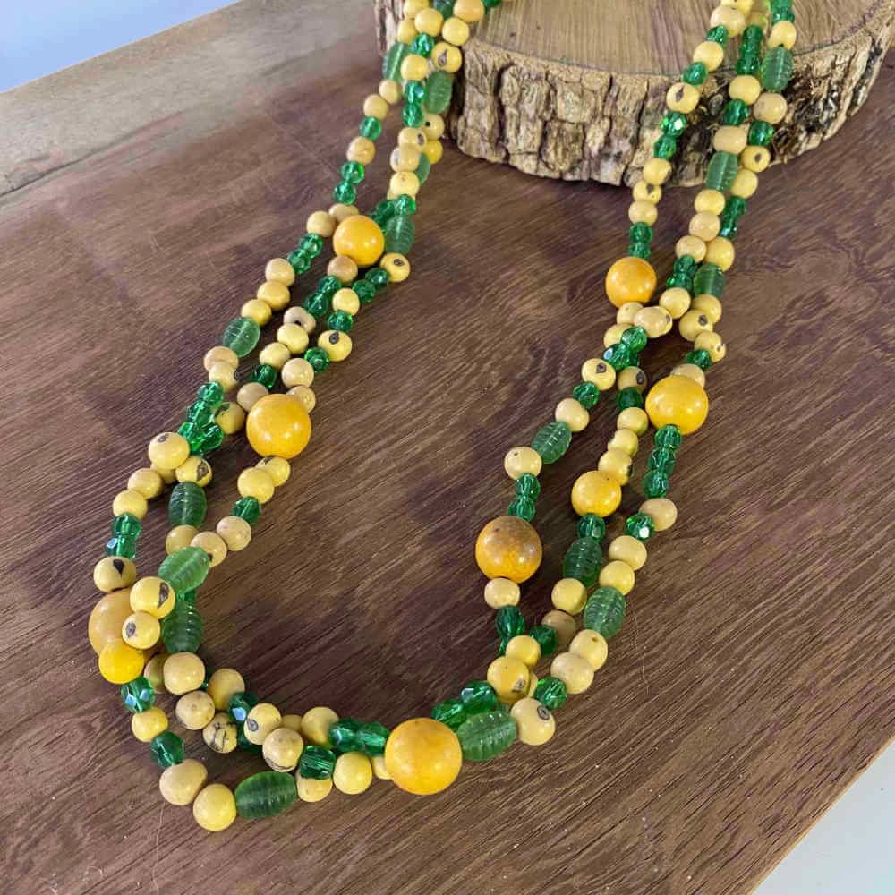 O colar possui três voltas, combinando sementes de açaí amarelas, sementes verdes, cristais de vidro facetados e detalhes em murano, criando brilho, movimento e contraste. Algumas sementes amarelas maiores de paxiubão trazem destaque e textura à composição, valorizando ainda mais o trabalho artesanal e a riqueza dos materiais naturais.