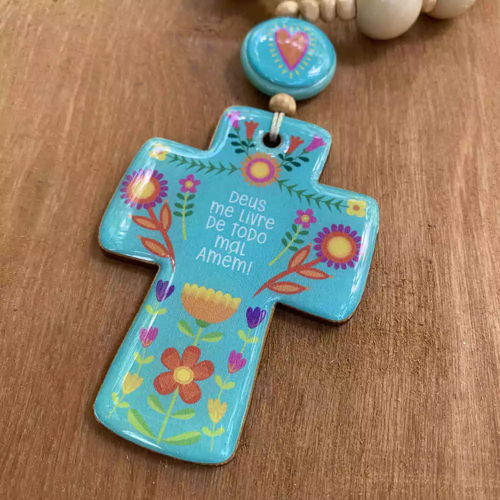 Feito em madeira sua cruz é decorada com aplicação de resina e a frase "Deus Me Livre de Todo Mal Amém!"