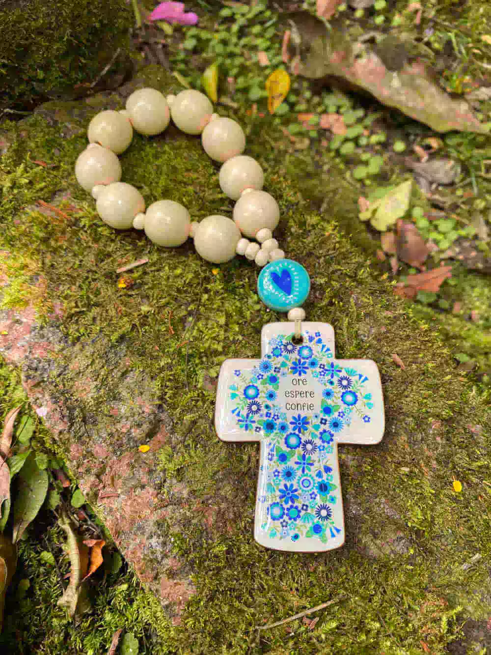 Feito em madeira sua cruz é decorada com aplicação de resina e a frase "Ore Espere Confie" .