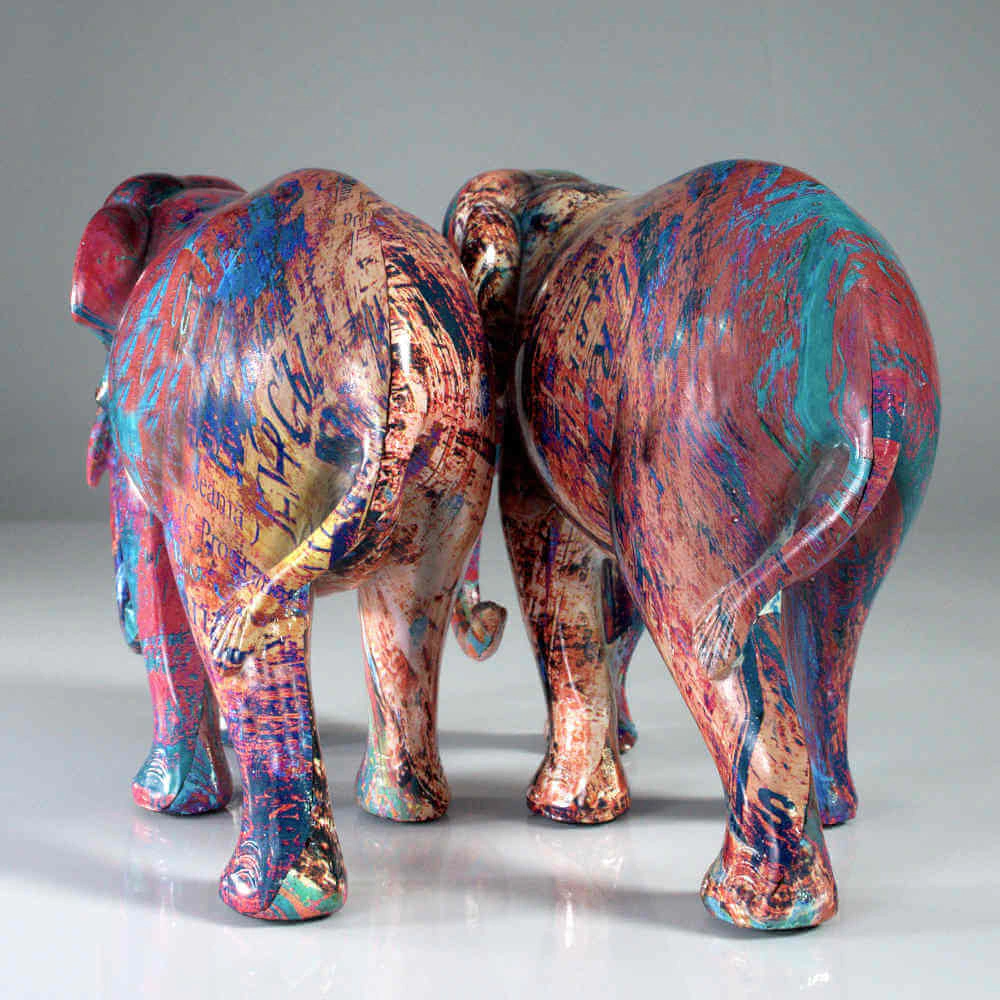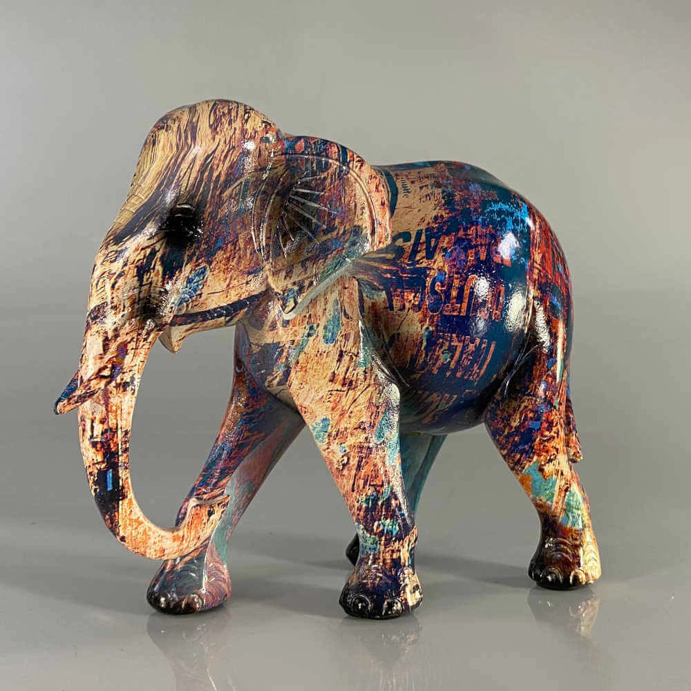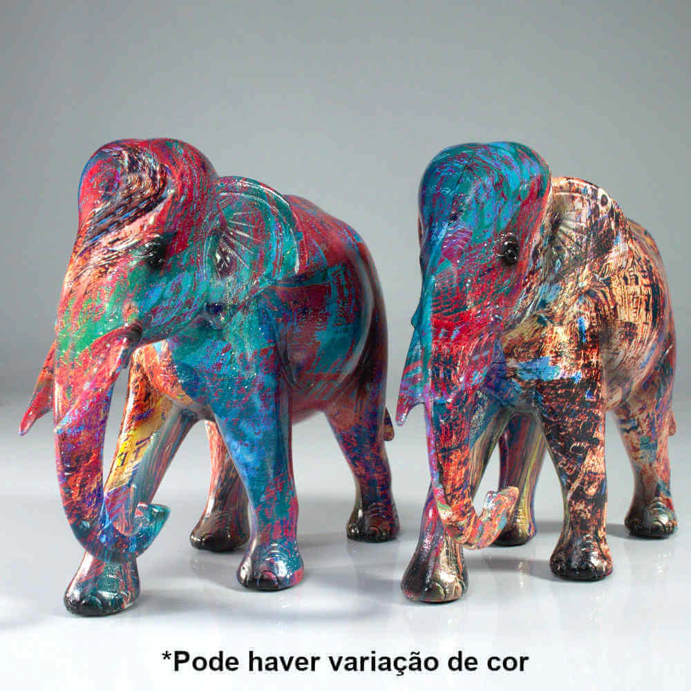 Esse elefante é uma versão mais contemporânea. Parece que saiu de dentro de uma tela abstrata. Cada peça é única devido ao trabalho.