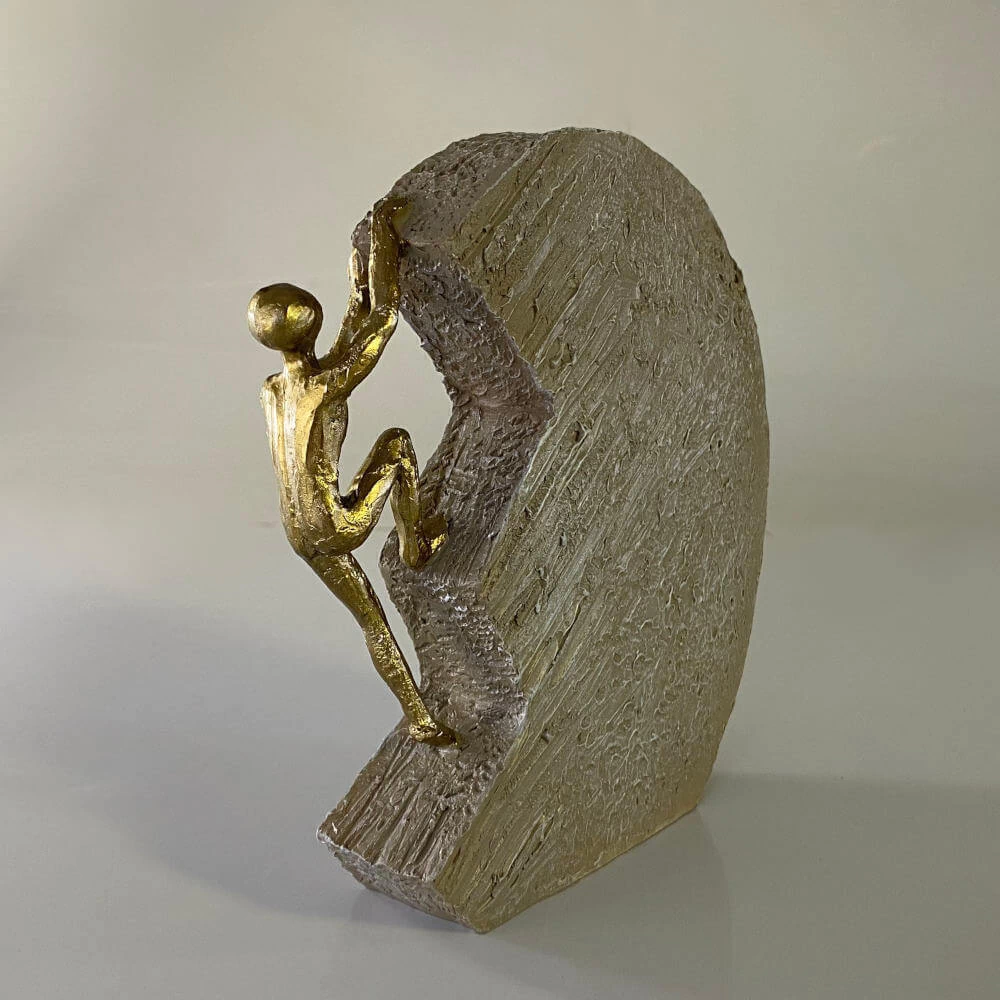 Esta escultura contemporânea representa a jornada de quem busca crescer, evoluir e superar desafios. Com linhas retas e formas minimalistas, a peça traduz de maneira simbólica o esforço humano de escalar a própria vida, vencer medos, obstáculos e limites, tanto no plano material quanto no espiritual.