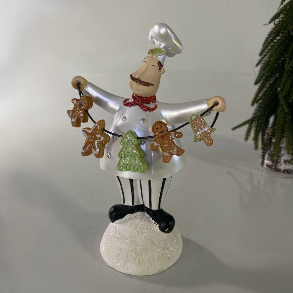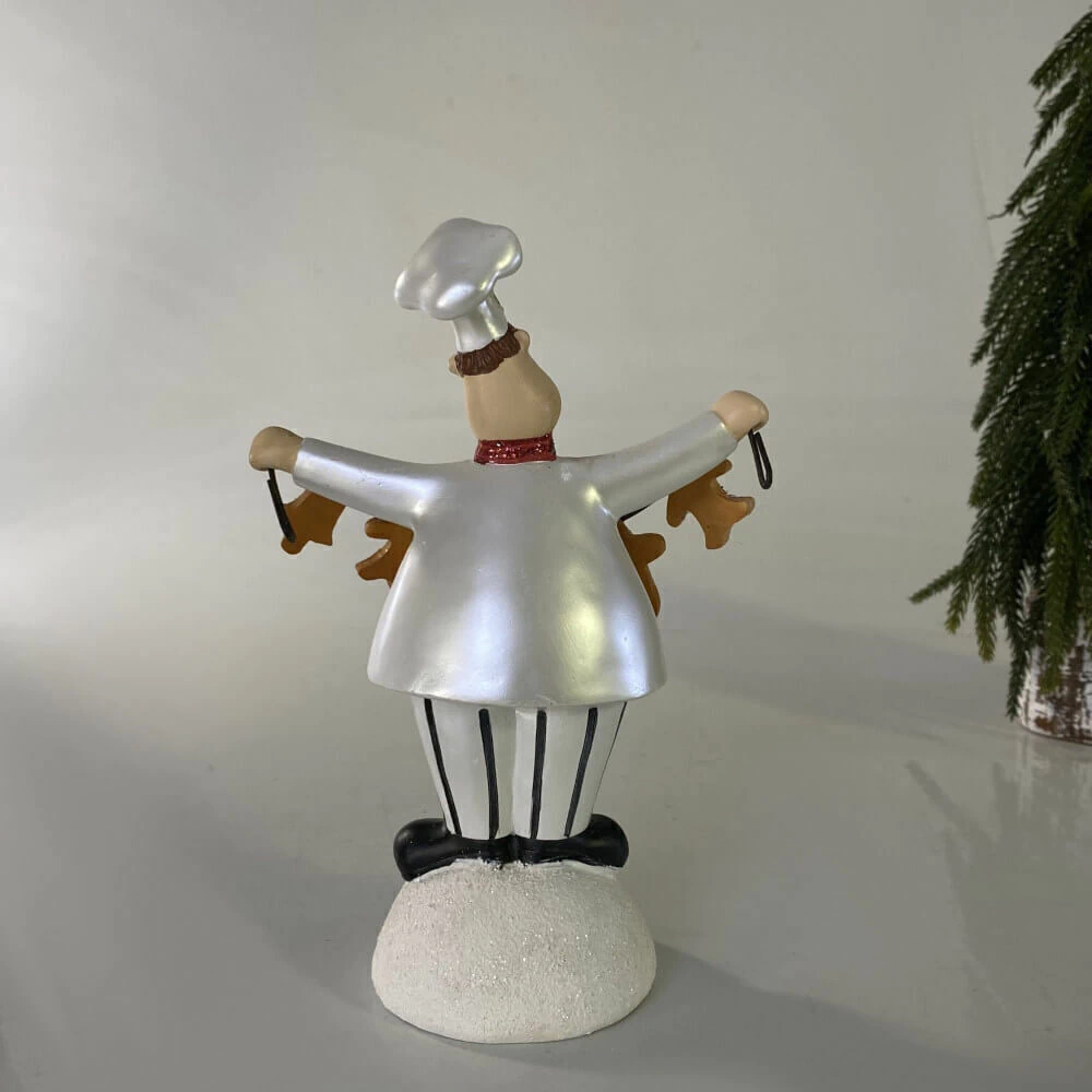 Esta escultura encantadora traz um cozinheiro sorridente segurando um varal de biscoitos natalinos, uma cena cheia de ternura, memória e espírito festivo. Feita com riqueza de detalhes, é uma peça que resgata o lado mais afetivo do Natal: os cheiros da cozinha, o carinho das receitas compartilhadas e a presença da família reunida.