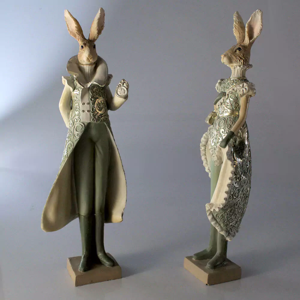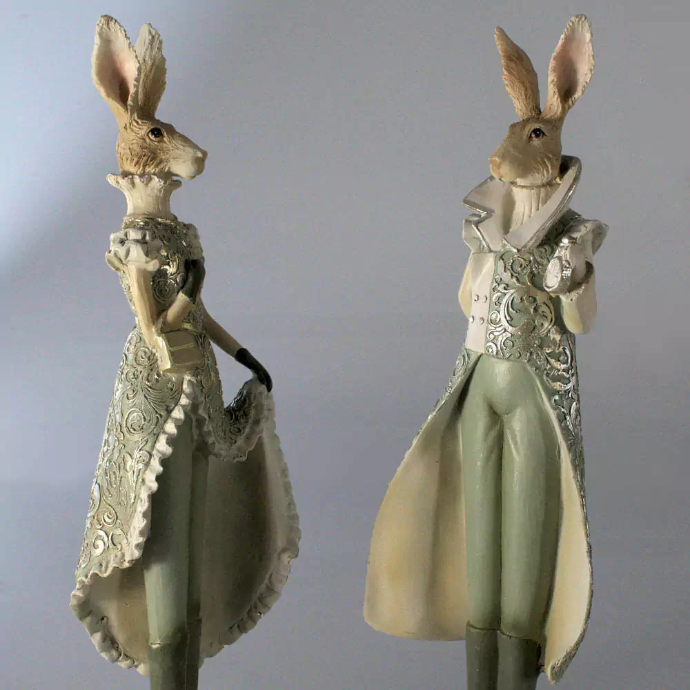 Um casal de coelhos vestidos com traje de gala para você decorar sua casa o ano todo.