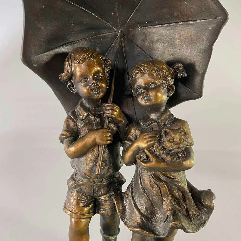 Menina e menino decorativos segurando um guarda-chuva e um gatinho.