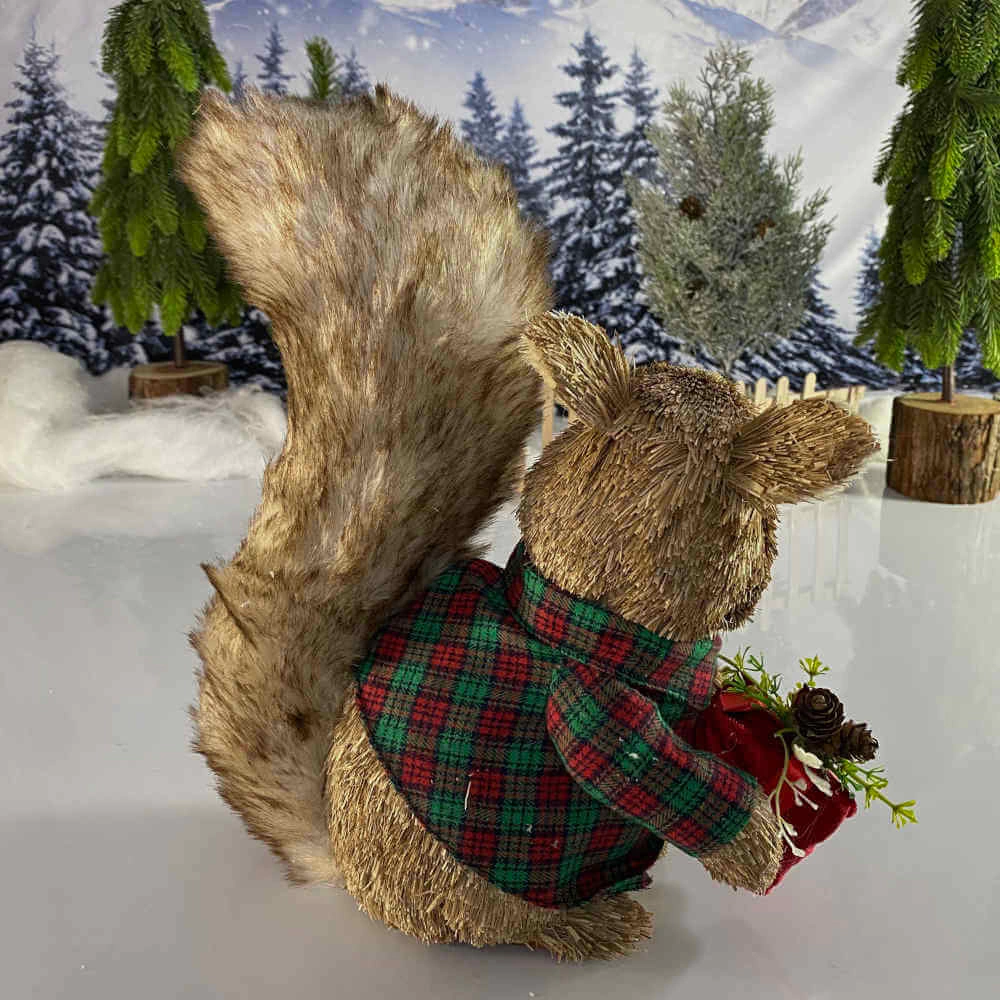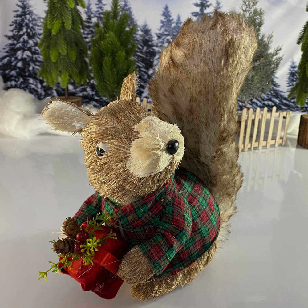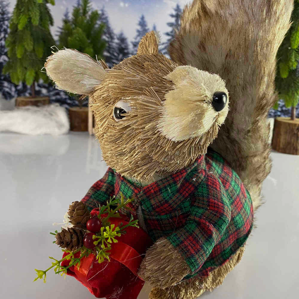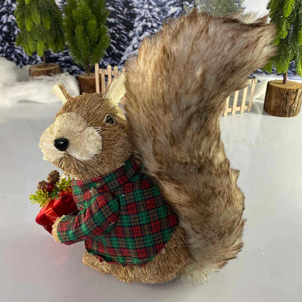 Um lindo e fofo esquilo feito em fribra natural com casaco xadrez.