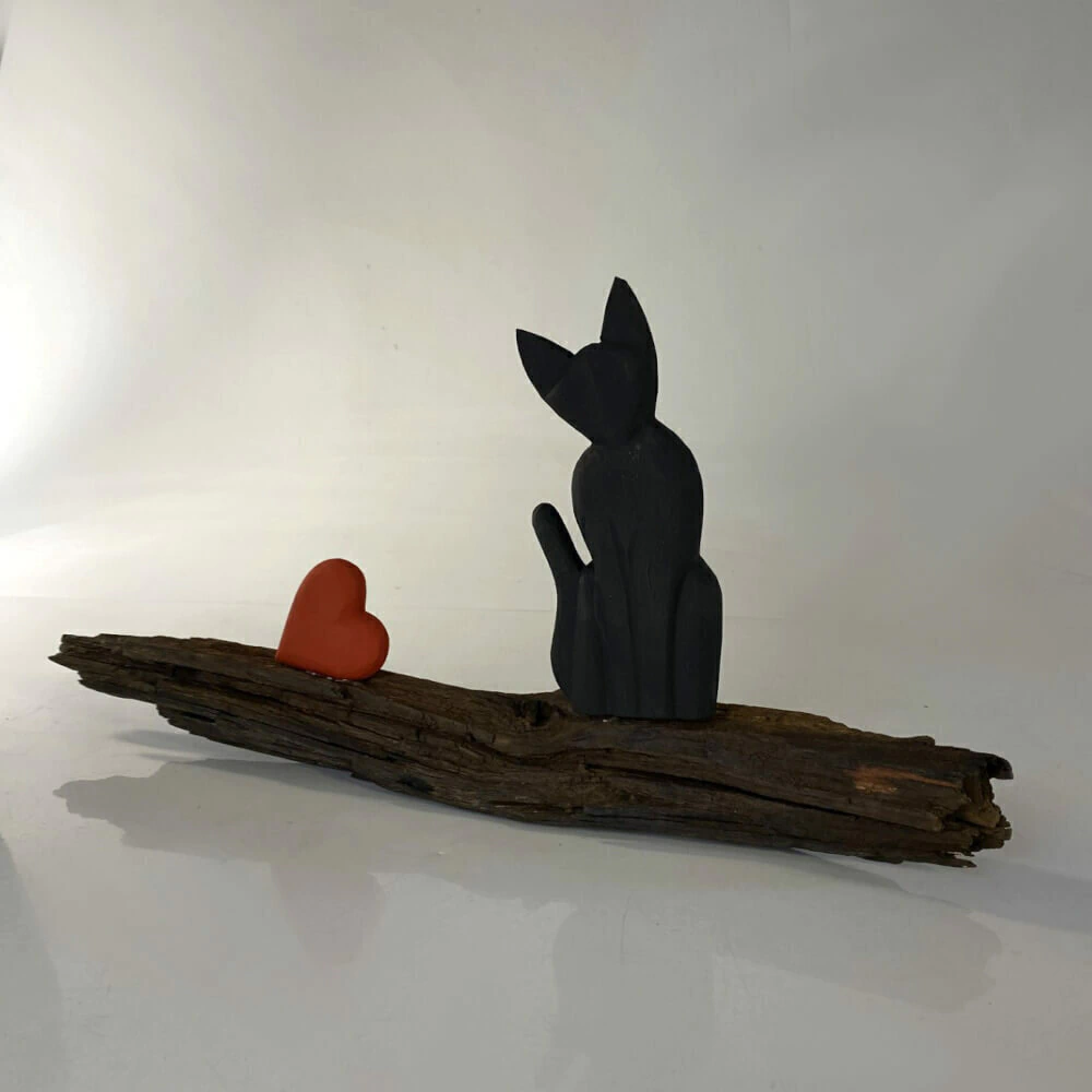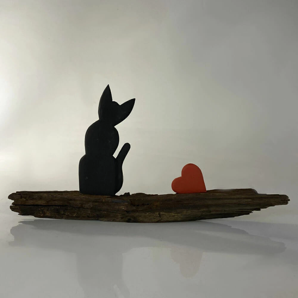 Esta escultura artesanal une três elementos cheios de significado: a força da madeira natural, a energia mística do gato preto e o calor simbólico de um coração vermelho.