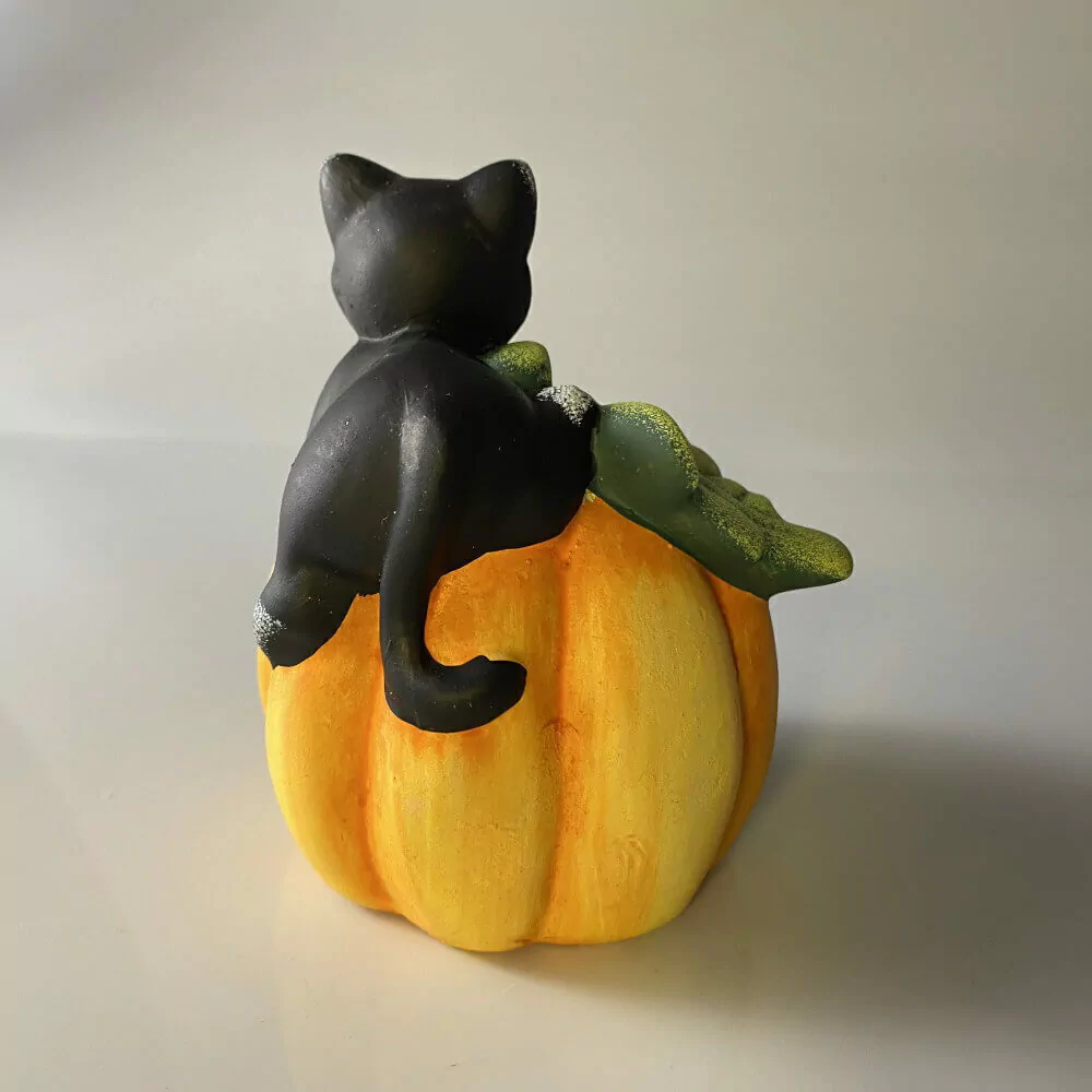 Enfeite com gato preto e abóbora para você decorar sua casa no dia das bruxas ou para você que faz coleção de gatinhos decorativos.