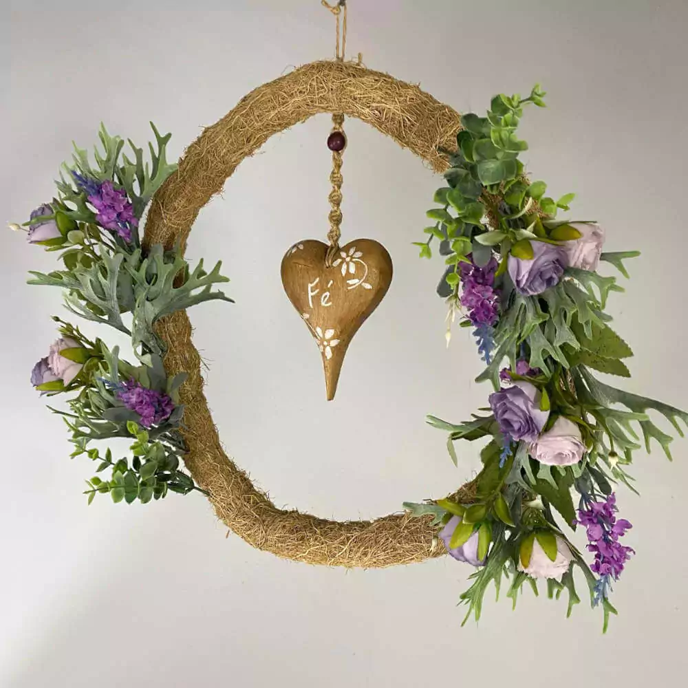 Destaque para o coração central em madeira com a palavra FÉ, esculpido e pintado a mão.