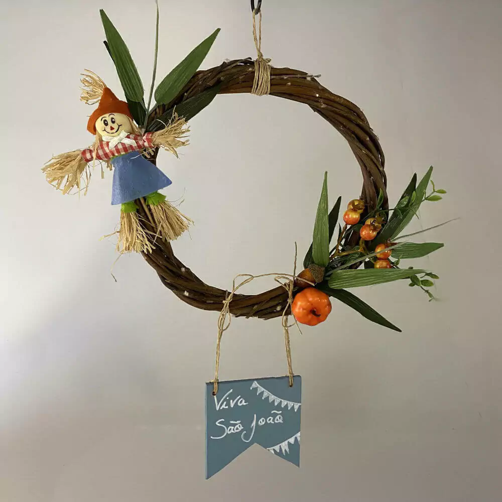 Feita em base de vime, essa guirlanda possui espantalho, aboboras e uma plaquinha em forma de bandeirinha com " Viva São João".
