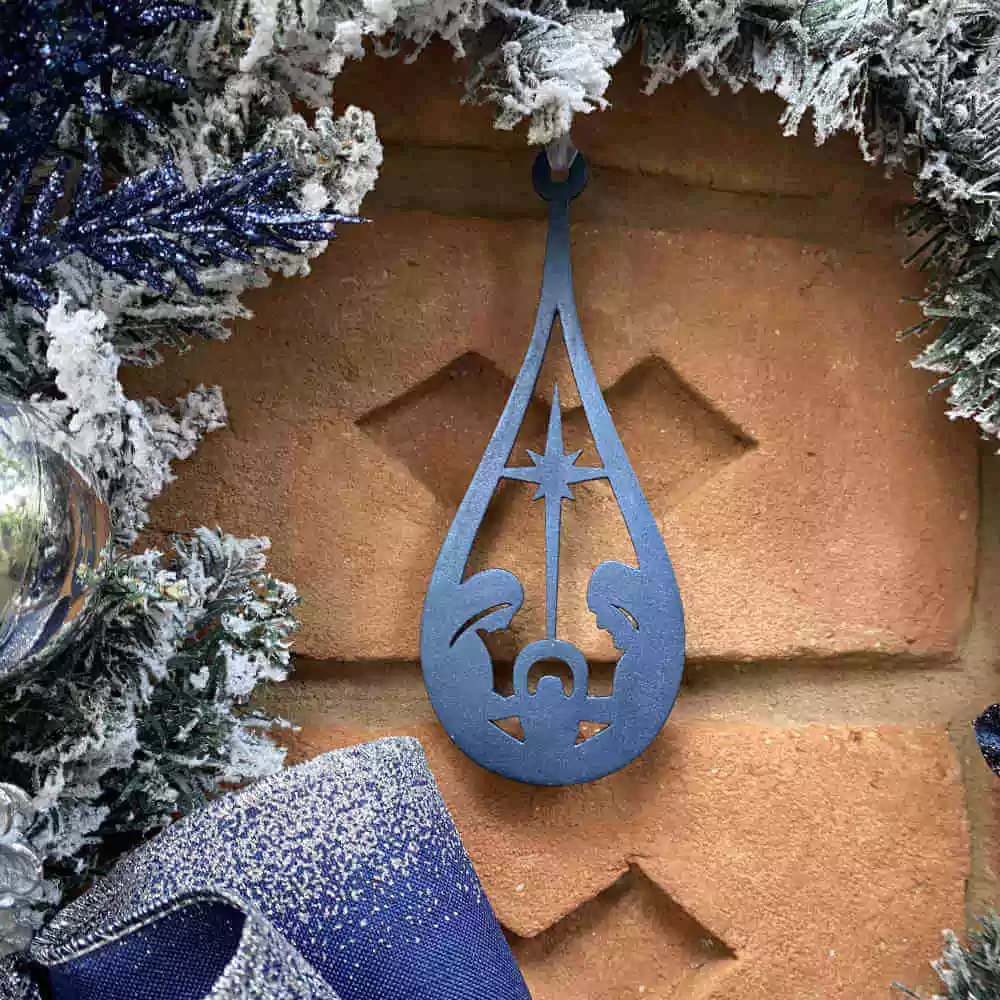 Guirlanda azul marinho com flores, bolas e folhagens, destaque para o pingente de Sagrada Família.